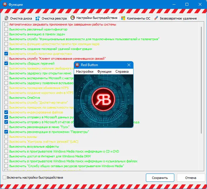 Red Button — это многофункциональная утилита для глубокой оптимизации операционной системы Windows, позволяющая ускорить работу компьютера, очистить реестр, удалить временные файлы и настроить скрытые параметры системы. Программа поддерживает все актуальные версии Windows и предлагает сотни инструментов для повышения производительности, безопасности и энергоэффективности. Благодаря интуитивному интерфейсу и компактному размеру, Red Button подходит как для новичков, так и для опытных пользователей.