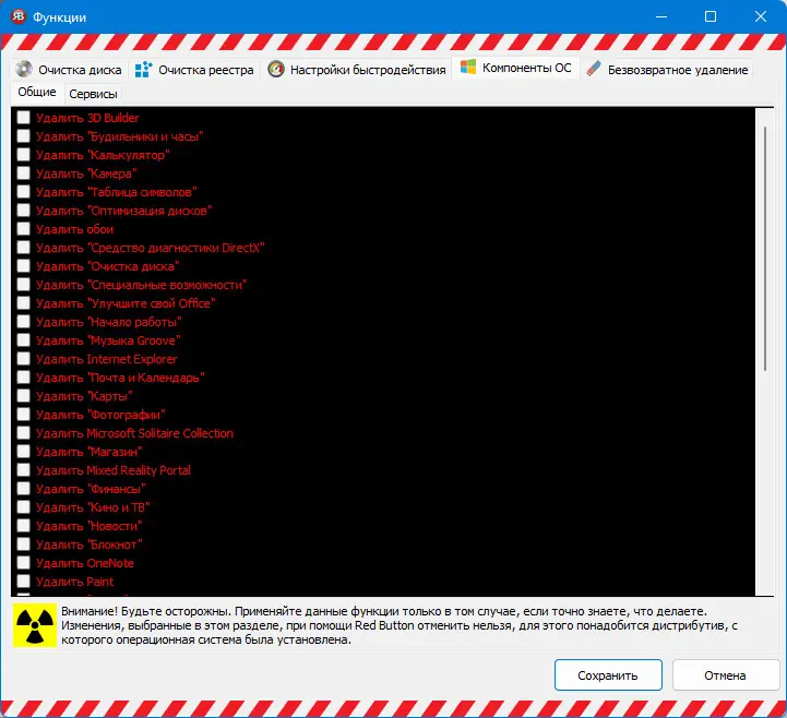 - Программа предлагает уникальную возможность удаления встроенных компонентов системы, что позволяет создать более легковесную и быструю среду.