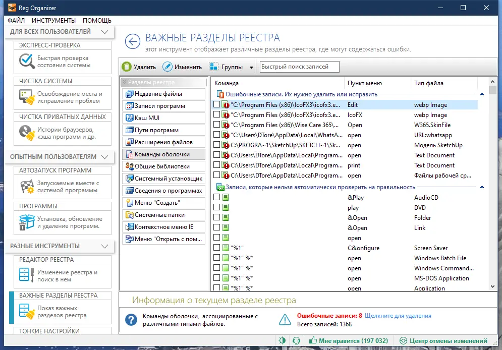 - Проводит тщательную чистку реестра, удаляя недействительные ссылки, дубликаты и артефакты удалённых программ.