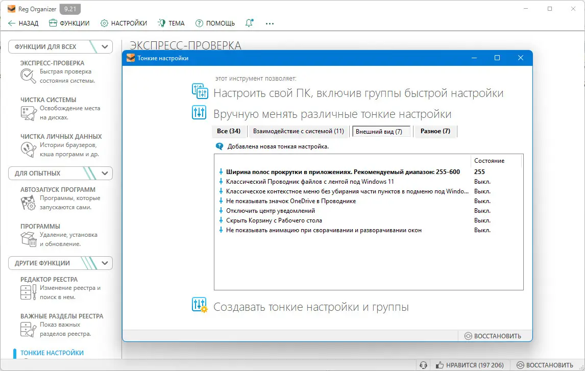 - Реализует функцию отслеживания изменений в реестре, фиксируя все действия приложений и позволяя вручную корректировать внесённые правки.