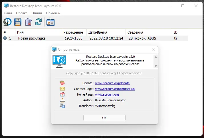 ReIcon позволяет не только сохранить, но и обновить ранее созданную резервную копию макета, что повышает гибкость управления рабочим столом.