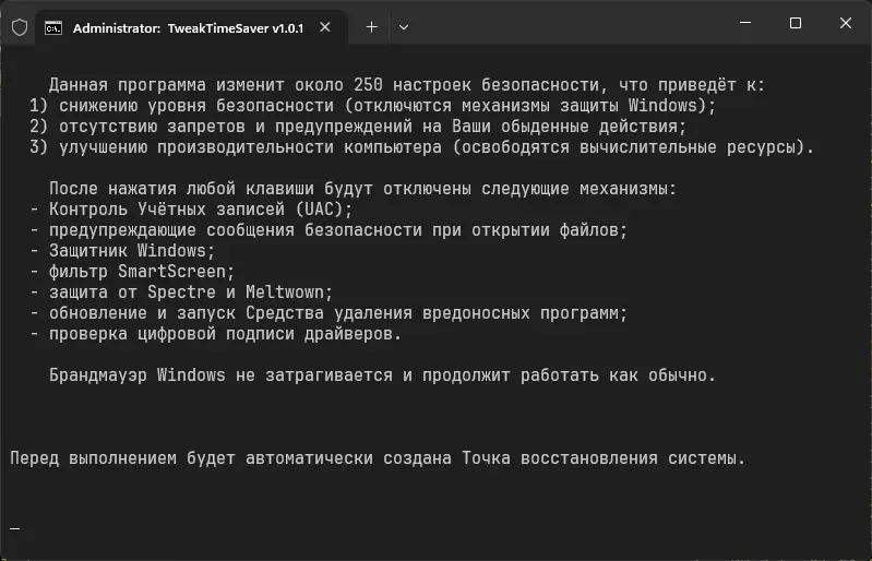 Программа представляет собой коллекцию файлов командной строки, каждый из которых отвечает за определённый аспект настройки системы. Подход TweakTimeSaver основан на простоте и предсказуемости: пользователь видит понятное название файла, запускает его, получает краткое описание предстоящих изменений и подтверждает действие. Перед внесением критичных правок система автоматически создаёт точку восстановления, что позволяет легко вернуться к предыдущему состоянию при необходимости. Такой метод исключает необратимые последствия и делает процесс настройки максимально безопасным.