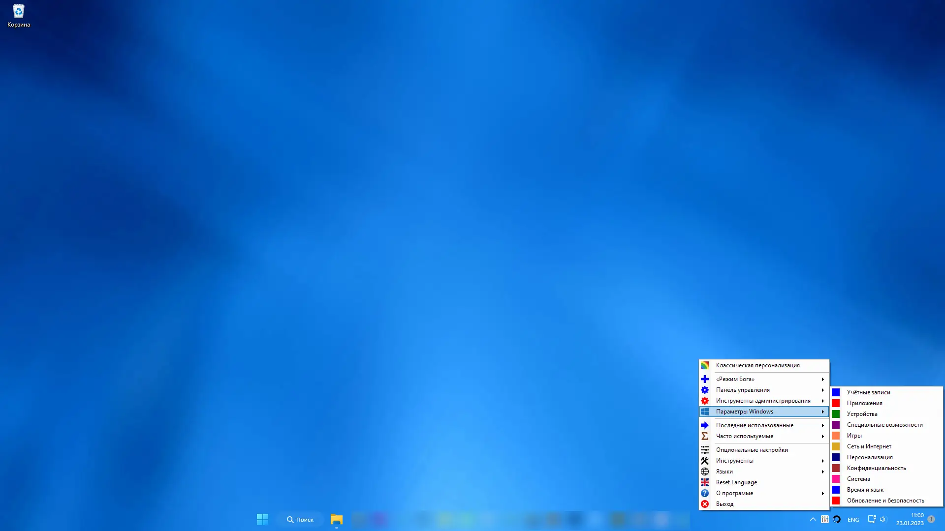 После запуска приложение размещает значок в трее, клик по которому по умолчанию открывает папку «Режим бога». Правый клик вызывает контекстное меню с группировкой функций: персонализация, системные инструменты, параметры и администрирование. Через встроенный раздел «Инструменты» можно создать ярлык «Режима бога» на рабочем столе, который будет работать независимо от запуска программы. В настройках доступно включение автозагрузки, изменение внешнего вида меню и выбор поведения при нажатии на иконку. Версия x32 считается экспериментальной, поэтому рекомендуется использовать 64-битную сборку для стабильной работы.