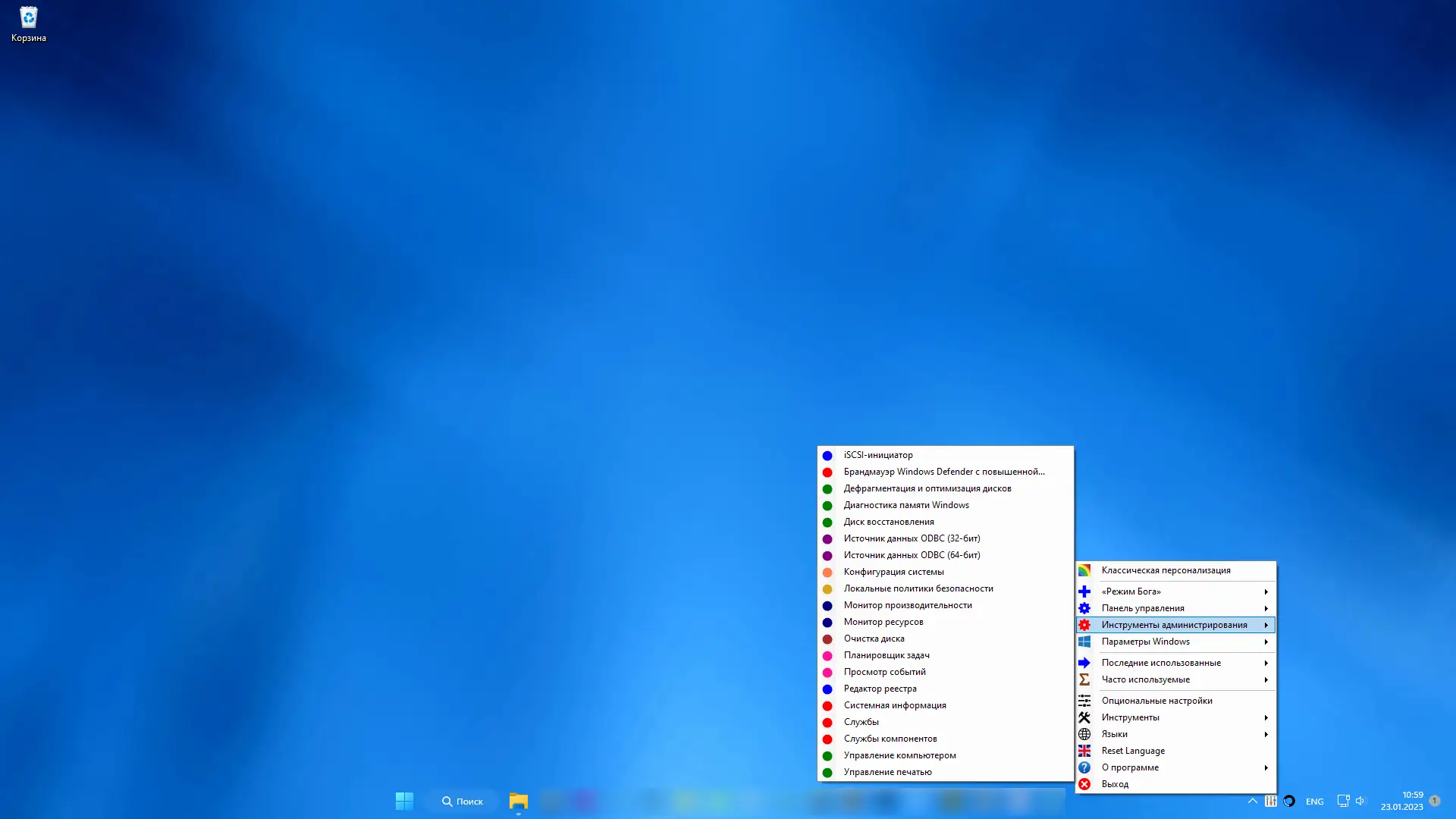 После запуска приложения в системном трее появляется значок, щелчок по которому открывает папку «Режим бога» — специальную директорию, содержащую все основные элементы управления системой. Правая кнопка мыши по значку вызывает контекстное меню с быстрыми ссылками: персонализация, инструменты администрирования, Панель управления, параметры Windows. В разделе «Инструменты» можно создать ярлык «Режима бога» на рабочем столе — он будет работать независимо от запуска самой программы. Через настройки активируется автозапуск и изменяется поведение интерфейса. Утилита совместима с последними версиями Windows, включая 10 и 11, но с ограничениями работает на более старых ОС.