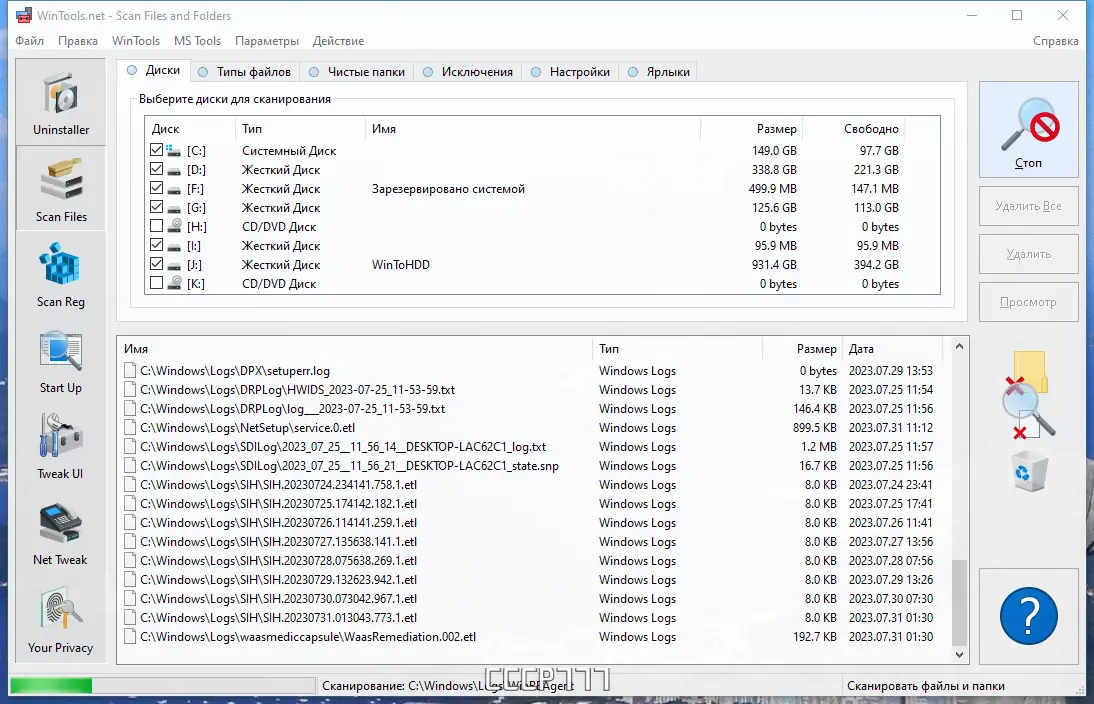 - Инструмент Scan Files сканирует жёсткий диск на наличие временных, кэшированных и ненужных файлов, которые замедляют работу системы.
