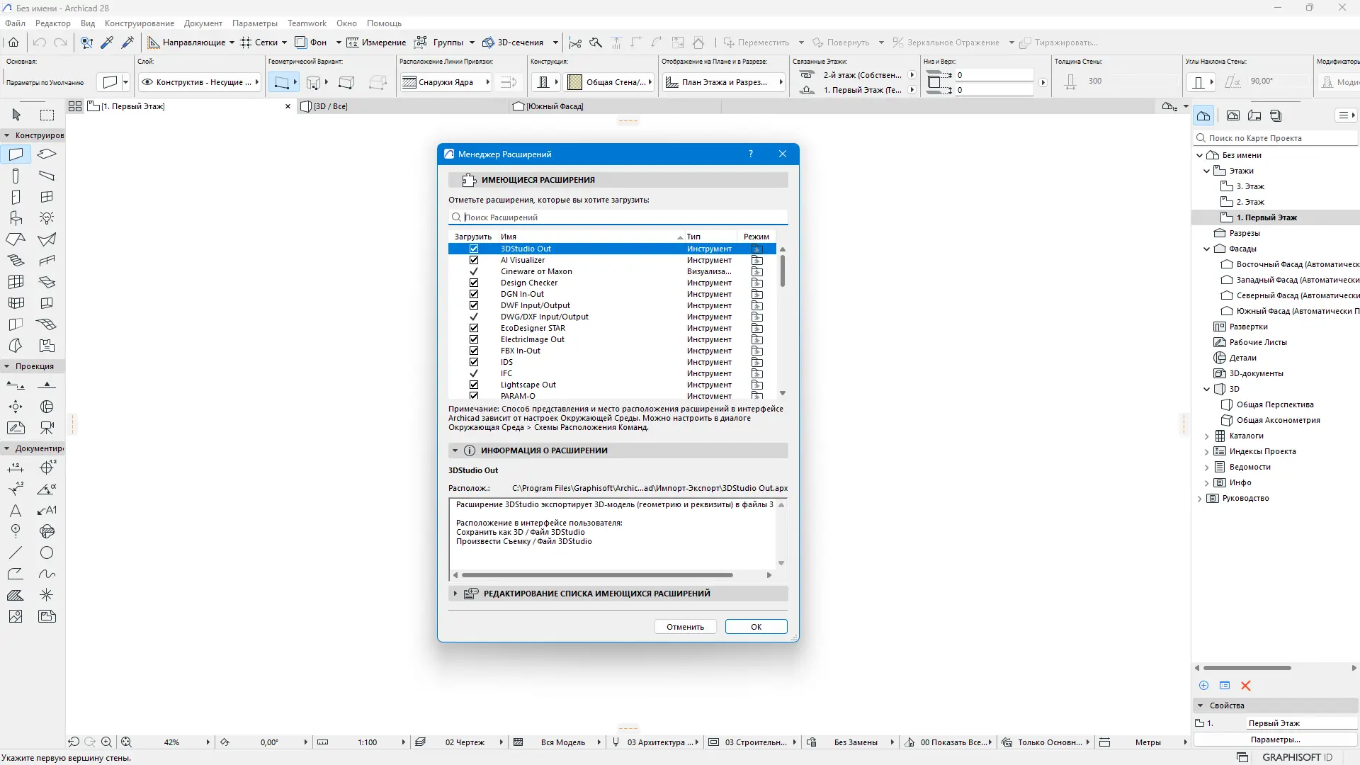 Работа с ArchiCAD начинается с создания 3D-каркаса здания, после чего добавляются стены, перекрытия, окна и двери с помощью интуитивных инструментов моделирования. Каждый элемент обладает параметрическими свойствами, позволяя быстро вносить изменения и адаптировать проект под новые требования. Интерфейс программы настраивается под рабочие процессы пользователя, а встроенные шаблоны и библиотеки объектов ускоряют начало проектирования.