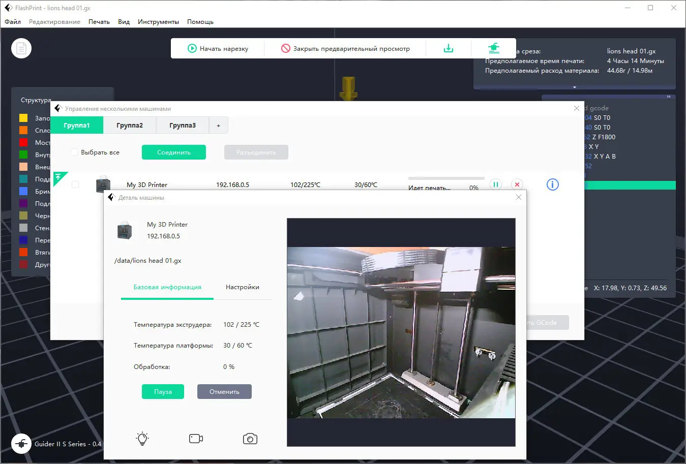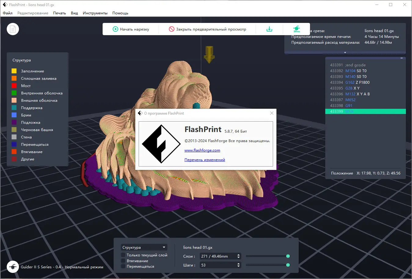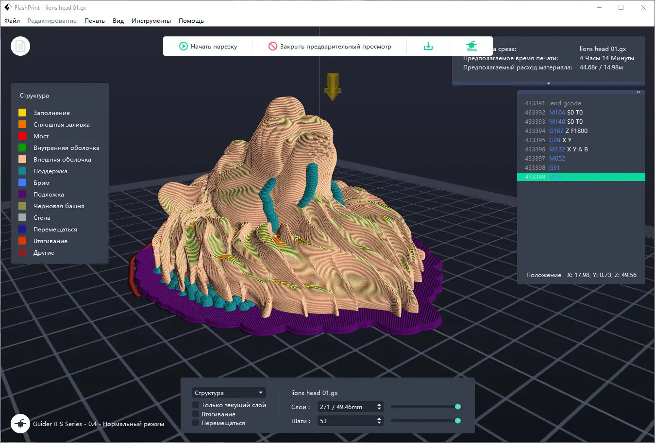 - Визуализация траектории экструзии с разбивкой по слоям и структурным элементам — оболочкам, поддерживающим конструкциям, плотам и внутреннему заполнению.