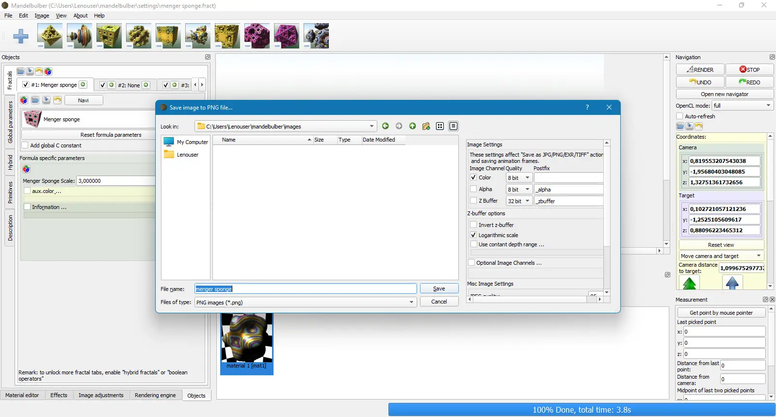 Управление в Mandelbulber интуитивно понятно благодаря простому 3D-навигатору, позволяющему свободно перемещаться внутри фрактальной сцены. Камеру можно вращать, перемещать вперёд-назад и вбок с помощью комбинаций клавиш, таких как Shift+Up/Down или W/S для вертикального движения. Работа с параметрами фракталов, материалами и освещением осуществляется через графический интерфейс, где доступны слайдеры, поля ввода и предустановленные пресеты. Анимация настраивается через ключевые кадры с различными типами интерполяции, что позволяет плавно изменять параметры во времени. Экспорт результатов возможен в виде изображений, 3D-объектов или видеороликов с сохранением дополнительных каналов — теней, глобального освещения и других.