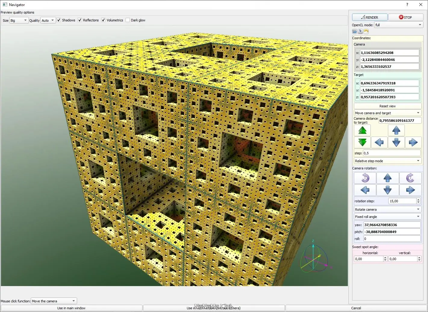 Работа с Mandelbulber начинается с выбора типа фрактала и настройки начальных параметров в главном окне редактора. Пользователь может свободно перемещаться в трёхмерном пространстве с помощью простого навигатора, используя клавиши W, A, S, D для движения и стрелки для вращения камеры. Дополнительные комбинации, такие как Shift для продвижения вперёд-назад и Ctrl для крена, позволяют точно позиционировать камеру для съёмки сложных фрактальных форм. Все изменения можно анимировать, задавая ключевые кадры и выбирая тип интерполяции между ними. Для автоматизации процесса предусмотрена командная строка, позволяющая запускать рендеринг на серверах без графического интерфейса.