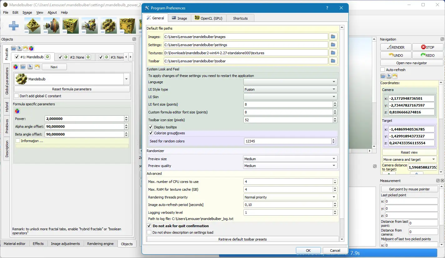 Интерфейс Mandelbulber построен на базе фреймворка Qt 5, что обеспечивает стабильность и кроссплатформенность. Навигация в трёхмерном пространстве осуществляется с помощью встроенного 3D-навигатора, который позволяет изменять точку обзора и параметры фрактала с мгновенным предварительным просмотром. Пользователь может настраивать материалы, управлять текстурами, задавать освещение и редактировать анимационные ключи через интуитивно понятные элементы управления. Для автоматизации процесса рендеринга доступен режим командной строки, удобный для серверных систем без графического интерфейса.