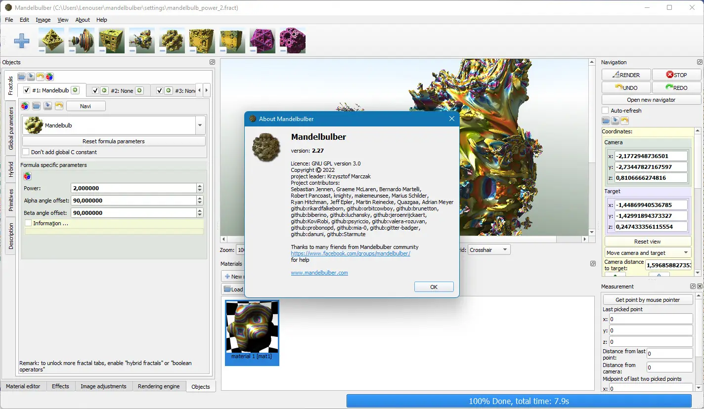 Mandelbulber разработан для глубокого погружения в мир трёхмерных фракталов, предлагая пользователям инструменты для исследования и визуализации сложных математических объектов. Программа поддерживает множество типов фракталов, включая Mandelbox, IFS, menger3M3d и другие, что делает её универсальной платформой для экспериментов. Гибкие настройки освещения, теней и материалов позволяют добиваться фотореалистичных результатов даже в сложных сценах.