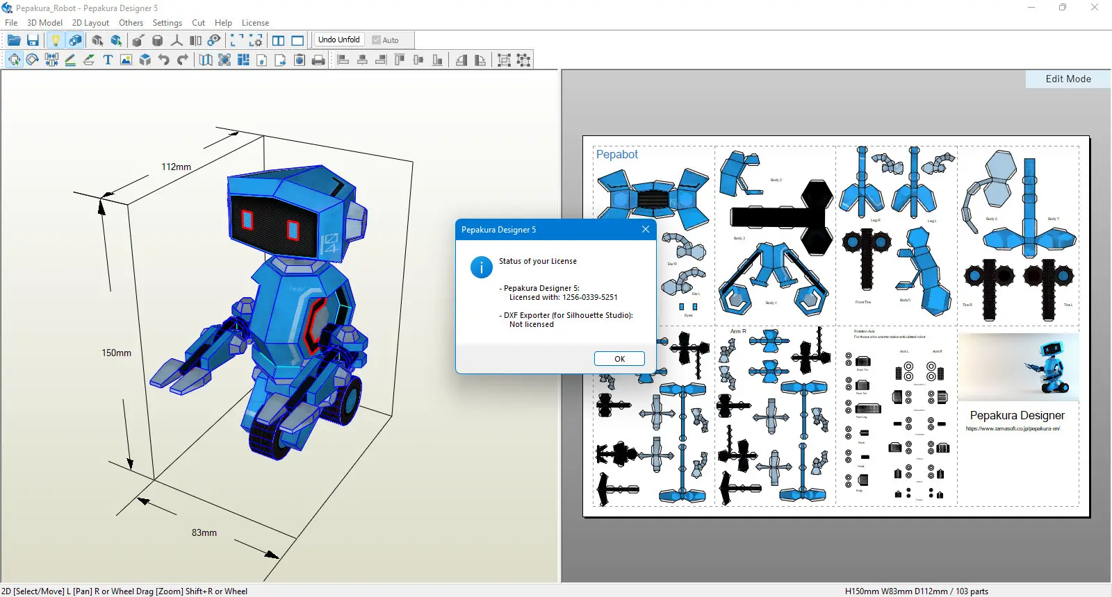 Работа с программой начинается с импорта 3D-модели в поддерживаемом формате, после чего система автоматически строит развертку. Пользователь может корректировать размещение частей, изменять размеры, добавлять обозначения и метки для удобства сборки. Готовую схему можно экспортировать в PDF или распечатать напрямую, а исходный проект сохраняется в формате PDO для дальнейшего редактирования или просмотра в Pepakura Viewer. Для защиты авторских проектов предусмотрена функция шифрования с использованием ключа.