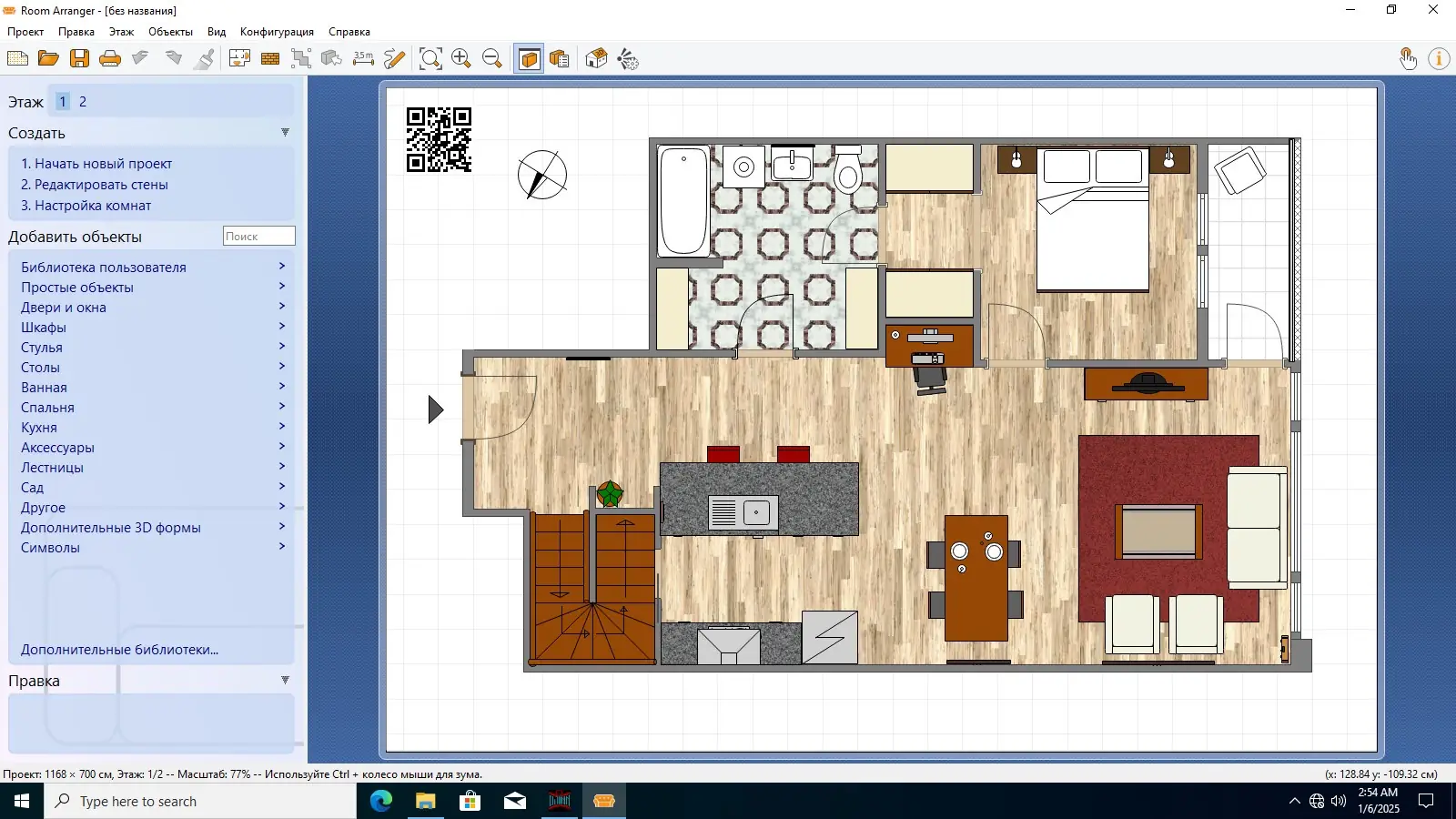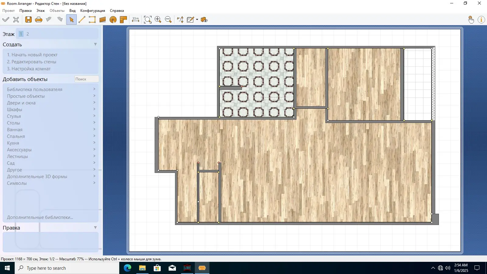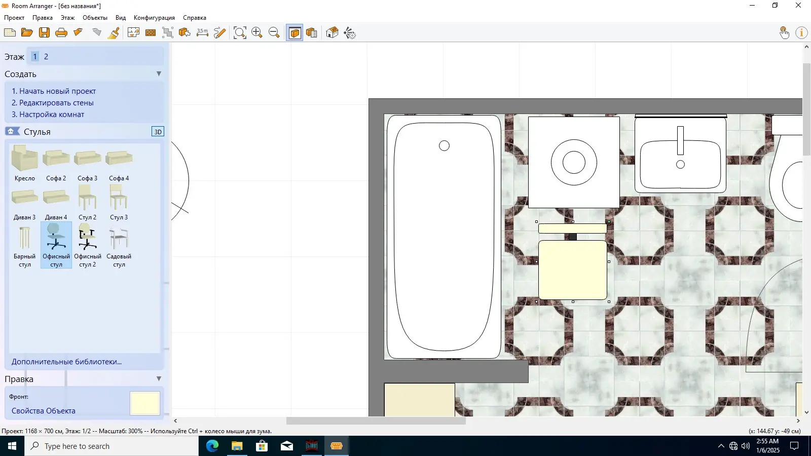 - Наличие встроенной библиотеки с типовыми объектами: шкафы, диваны, светильники, розетки