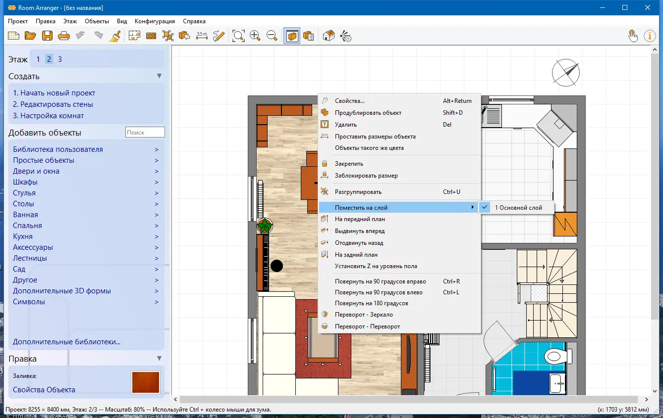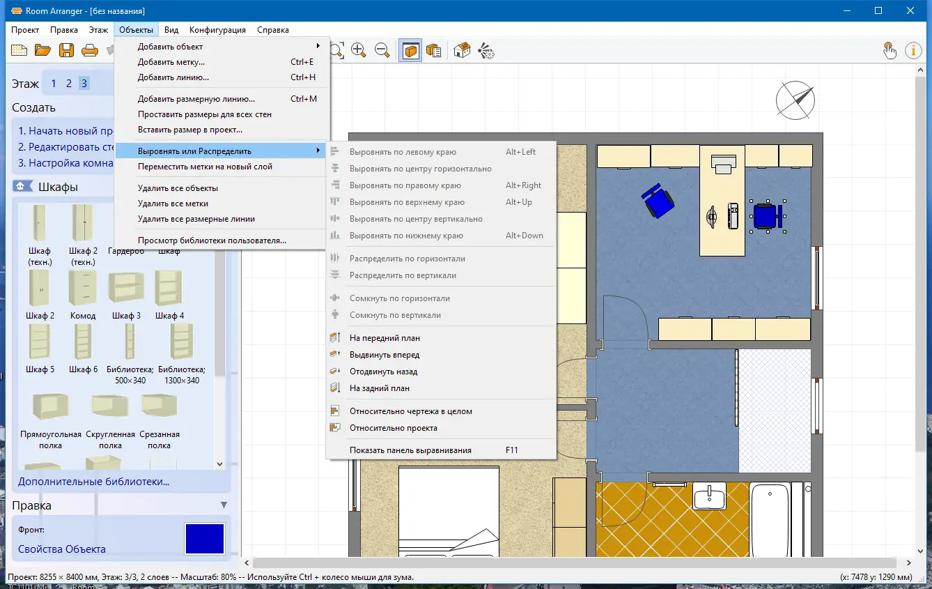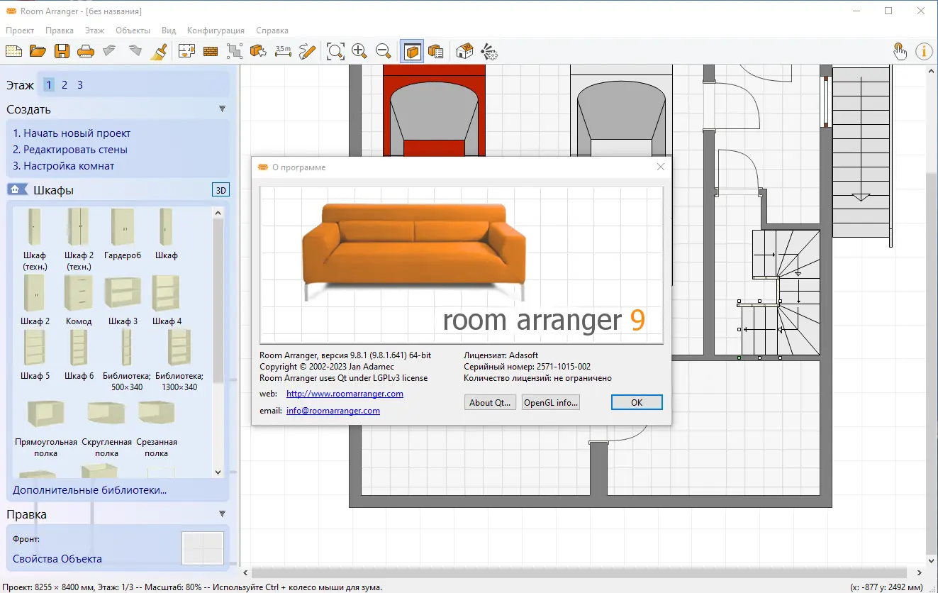 Room Arranger разработана для тех, кто хочет спланировать интерьер без привлечения профессионалов. С её помощью можно моделировать любые помещения — от небольшой квартиры до просторного офиса. Пользователь может задавать точные размеры стен, указывать толщину перегородок и вносить изменения в планировку в реальном времени. Программа поддерживает работу с объектами стандартных габаритов — шкафами, диванами, бытовой техникой, осветительными приборами и розетками.