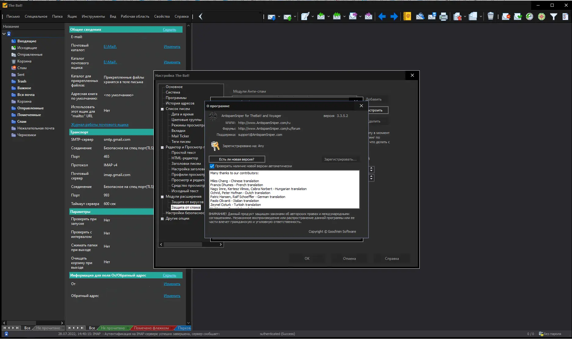 Установка и настройка AntispamSniper не требует глубоких технических знаний. После инсталляции плагин автоматически интегрируется в интерфейс The Bat! или Voyager, добавляя панель инструментов с функциями управления. С её помощью можно запускать фильтрацию, просматривать логи, обучать систему и включать режим тестирования. Регистрация коммерческой версии осуществляется через ввод имени и ключа из файла key.txt в разделе настроек. Для пользователей, которые интересуются, как настроить for the bat, доступен подробный интерфейс с логикой правил и предустановленными шаблонами.
