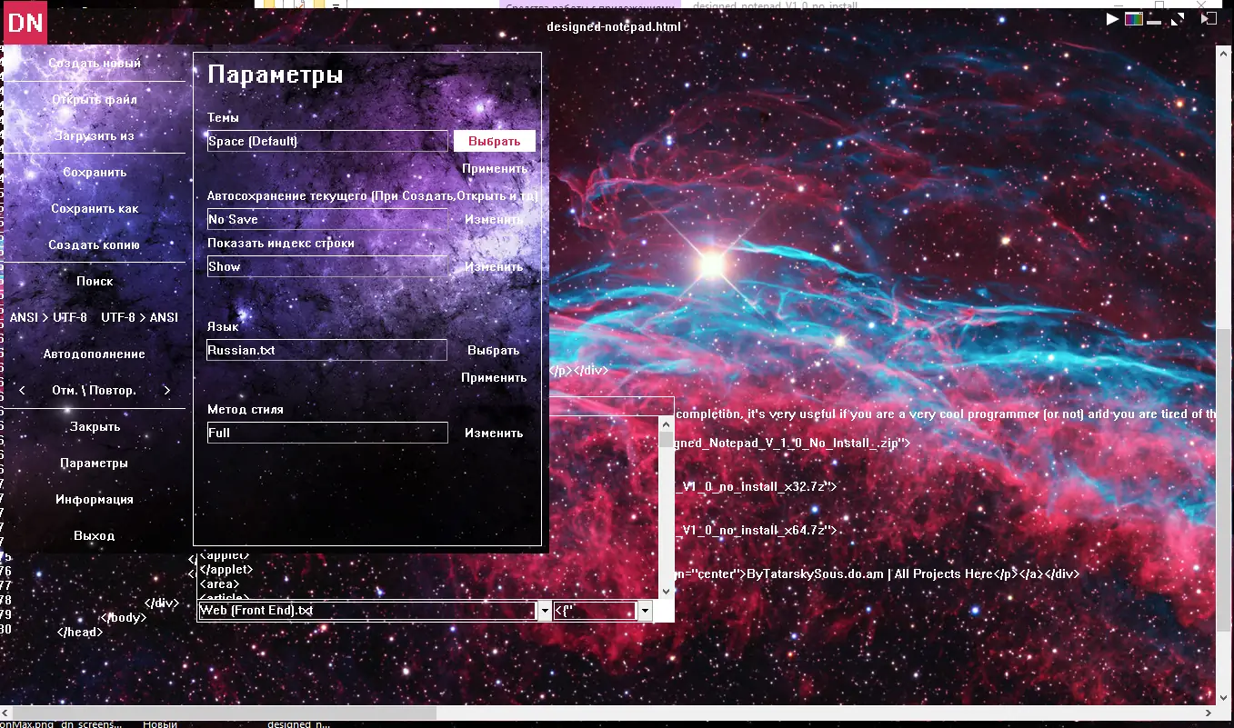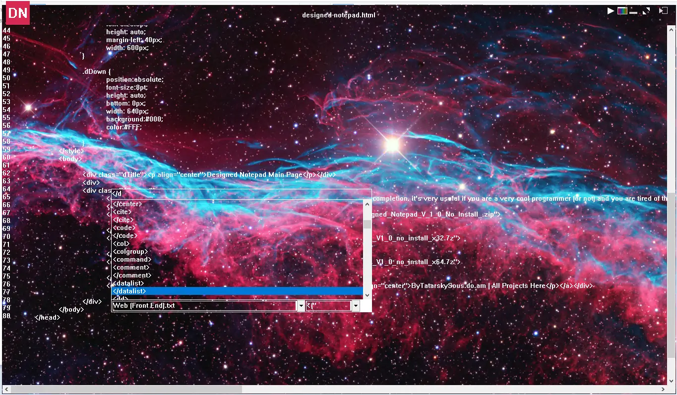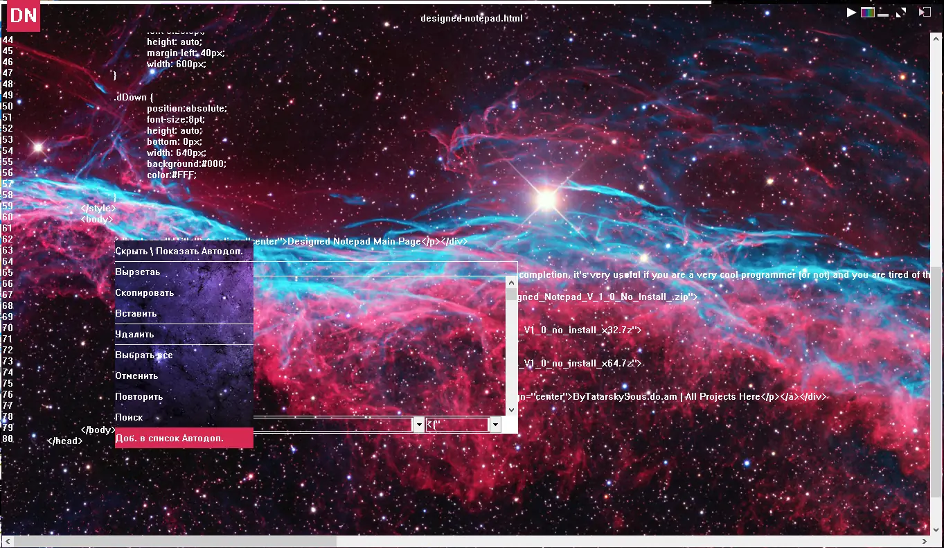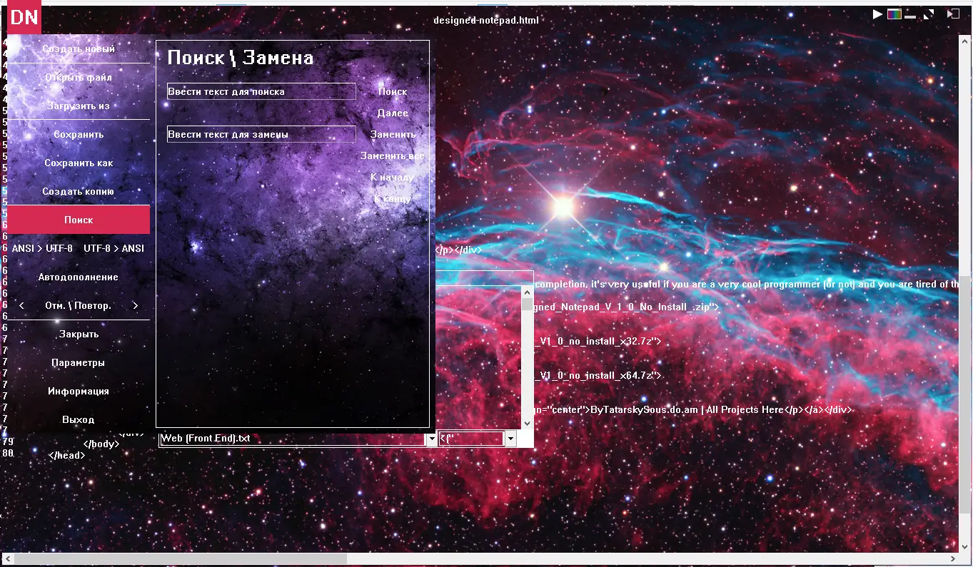 Designed Notepad — это компактный и гибкий текстовый редактор, ориентированный на пользователей, которым важна персонализация рабочей среды и свобода в настройке инструментов. Программа поддерживает вставку изображений и анимированных GIF-файлов в качестве фона, позволяет настраивать автодополнение под собственные нужды и работает без установки. Подходит для программистов, разработчиков и тех, кто ценит минимализм и функциональность в повседневной работе с текстом.