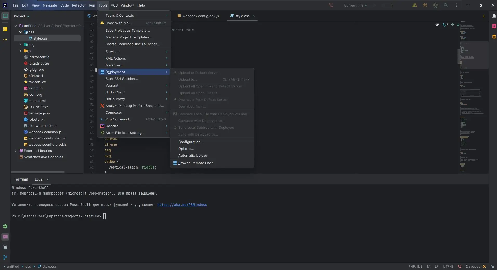 - Редактор поддерживает не только PHP, но и фронтенд-технологии: HTML5, CSS, TypeScript, Sass, а также инструменты вроде Emmet для ускоренного написания разметки.