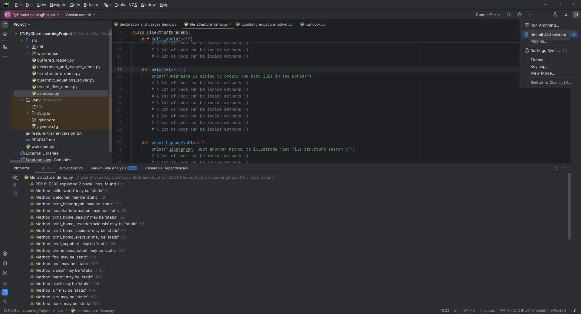 Запуск программы начинается с создания нового проекта или открытия существующего. После выбора интерпретатора python и настройки окружения можно приступать к написанию кода. Редактор автоматически предлагает автодополнение, анализирует код на наличие ошибок и предлагает исправления. Навигация по файлам и классам осуществляется через панель проекта, а быстрый переход к определению выполняется по двойному щелчку или сочетанию клавиш.