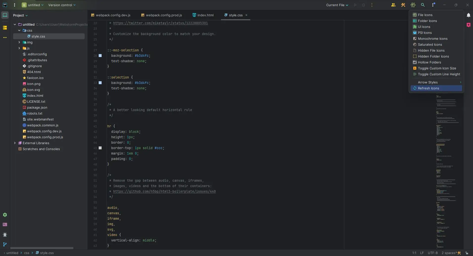- Поддержка препроцессоров Sass, Less и инструментов сборки, таких как Webpack и Gulp.
