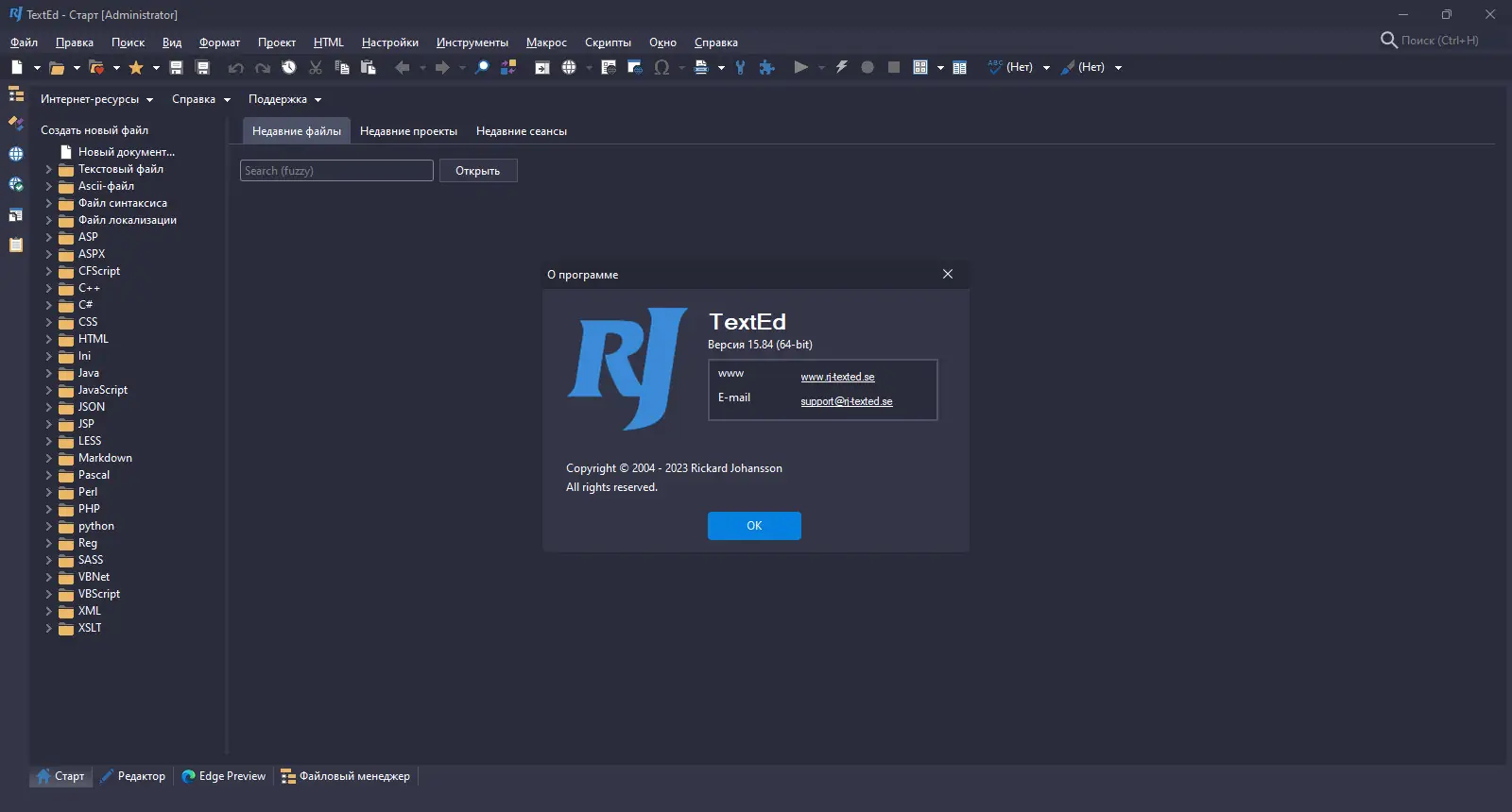 Пользоваться RJ TextEd просто благодаря интуитивно понятному интерфейсу и логичной структуре. После запуска программы можно открыть файл напрямую или создать новый, выбрав нужный язык программирования для активации соответствующей подсветки синтаксиса. Боковая панель предоставляет быстрый доступ к файловой системе, FTP-соединениям, буферу обмена и проектам, что ускоряет навигацию и работу с несколькими документами одновременно. Встроенный предпросмотр HTML позволяет видеть результат верстки без необходимости переключаться в браузер.