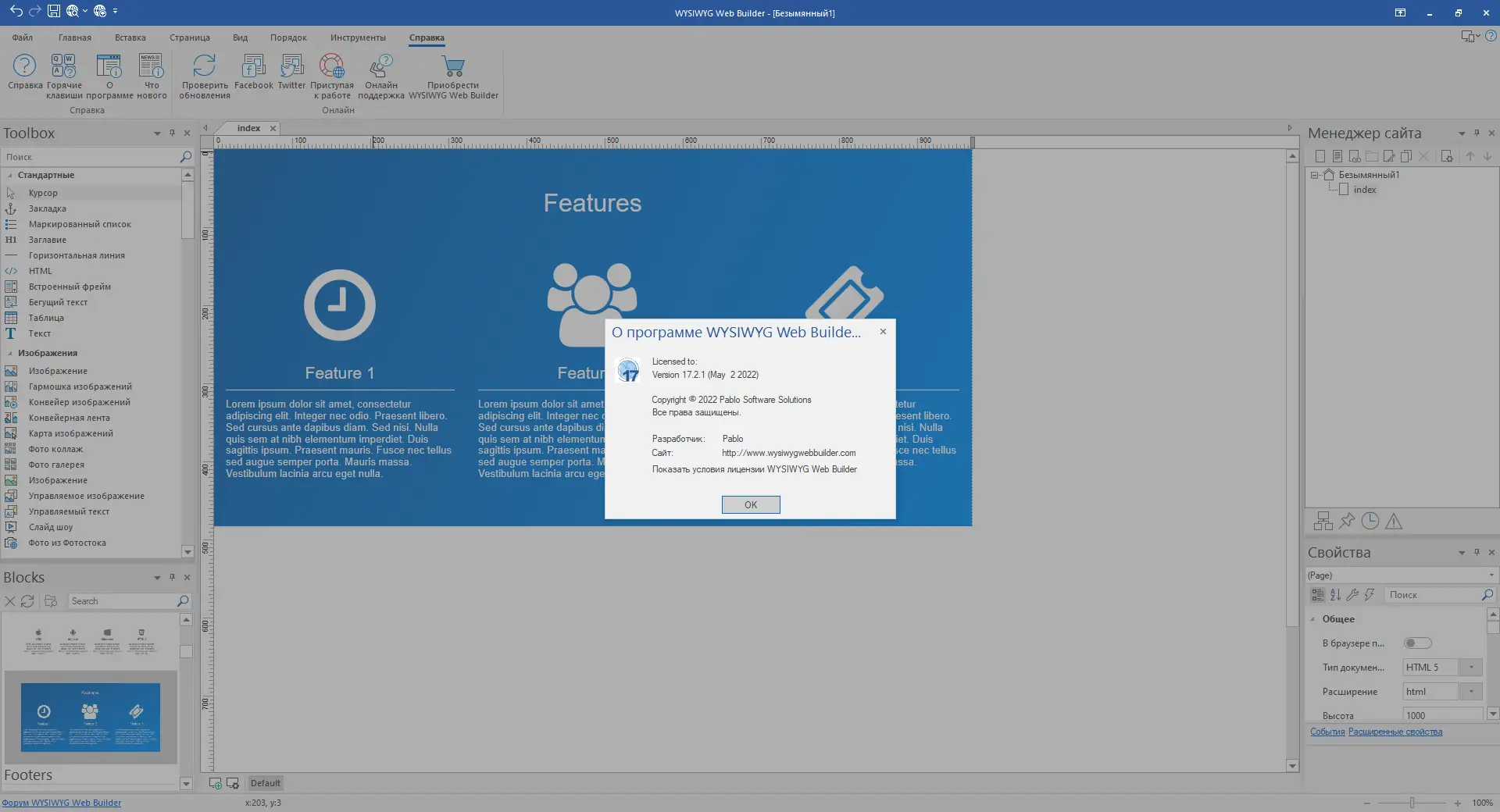 Работа с программой начинается с выбора шаблона или создания страницы с нуля. Пользователь может перетаскивать элементы — текстовые блоки, изображения, кнопки, формы — на рабочую область, точно позиционируя их с помощью сетки или координат. Каждый объект настраивается через панель свойств: можно изменить размер, шрифт, цвет, эффекты, поведение при наведении и многое другое. После завершения дизайна сайт публикуется через встроенный менеджер публикаций, который поддерживает FTP, FTPS и SFTP.