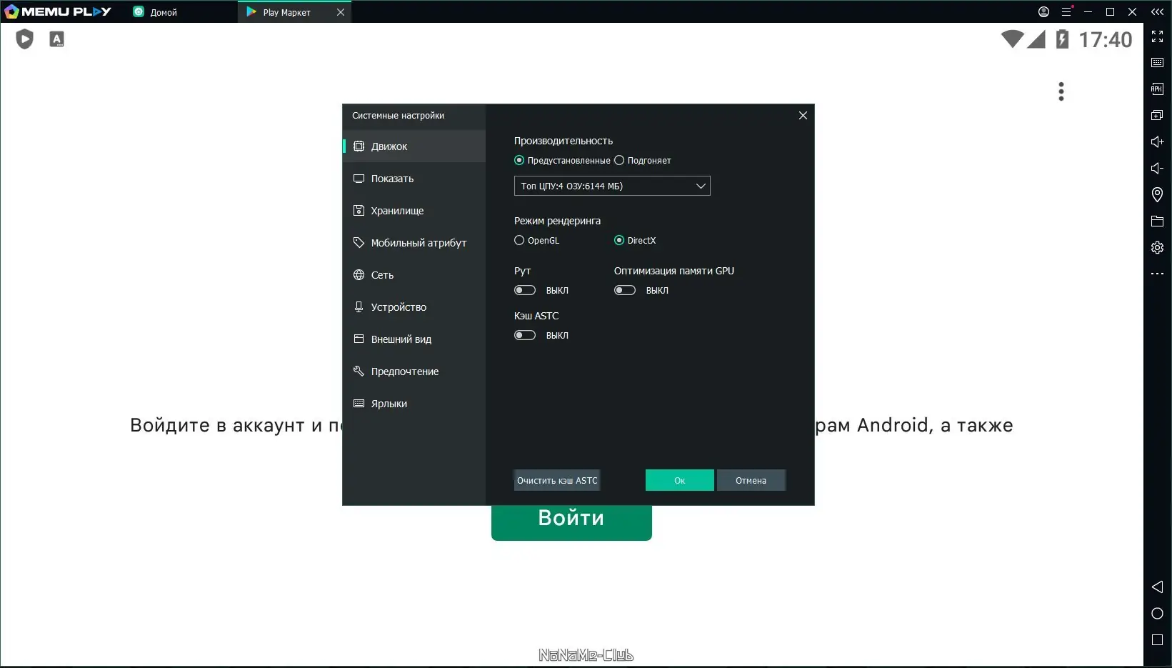 - Возможность настройки параметров виртуального устройства: ОЗУ, разрешение, количество ядер