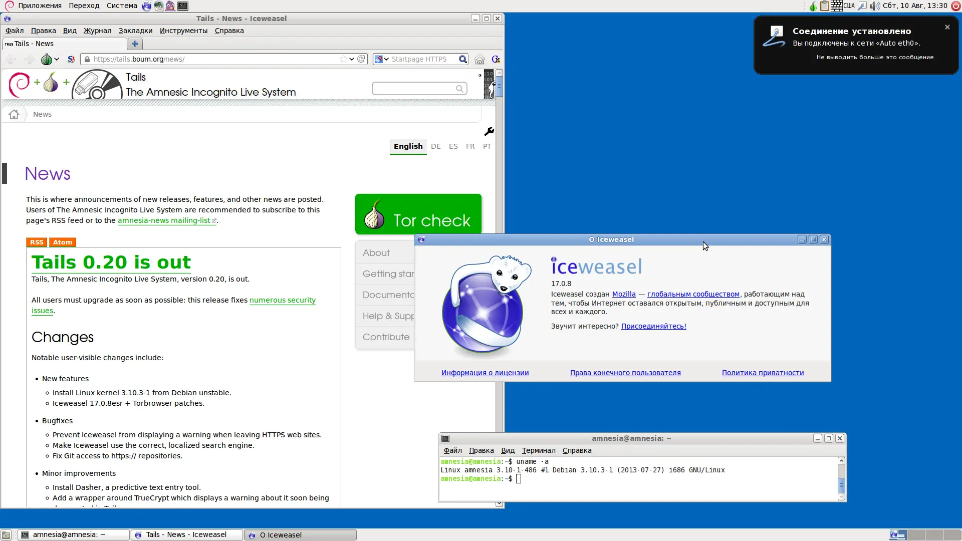 - Обновлённый браузер на базе Firefox 24.4.0esr с патчами Tor и Iceweasel для повышения стойкости к атакам.