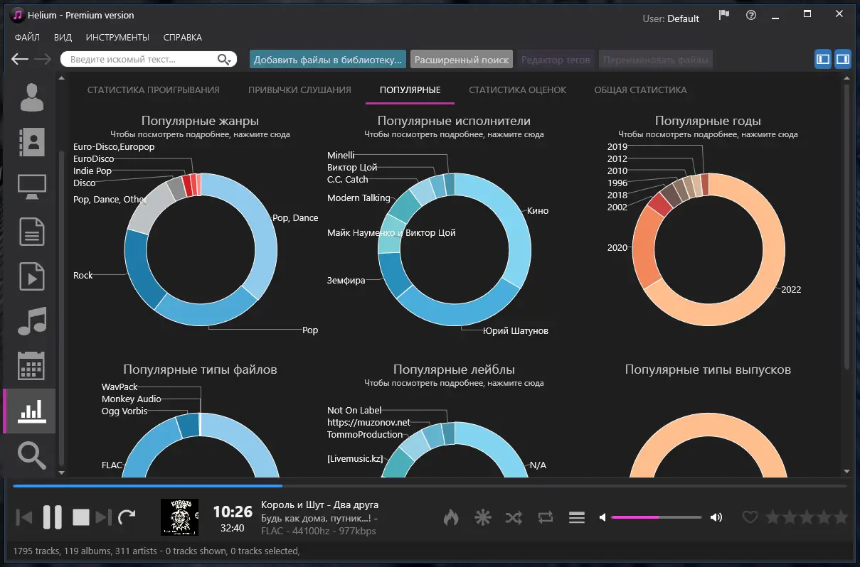 Helium Music Manager — универсальный инструмент для организации, редактирования и воспроизведения музыкальных файлов, сочетающий функции каталогизатора, редактора тегов, менеджера плейлистов и средства анализа аудиоколлекций. Программа поддерживает работу с большинством распространённых форматов, включая MP3, FLAC, AAC, WAV и другие, обеспечивая точную синхронизацию метаданных и удобную навигацию по библиотеке. Благодаря расширенным возможностям импорта и автоматизации, пользователь может быстро привести свою музыкальную коллекцию в порядок.