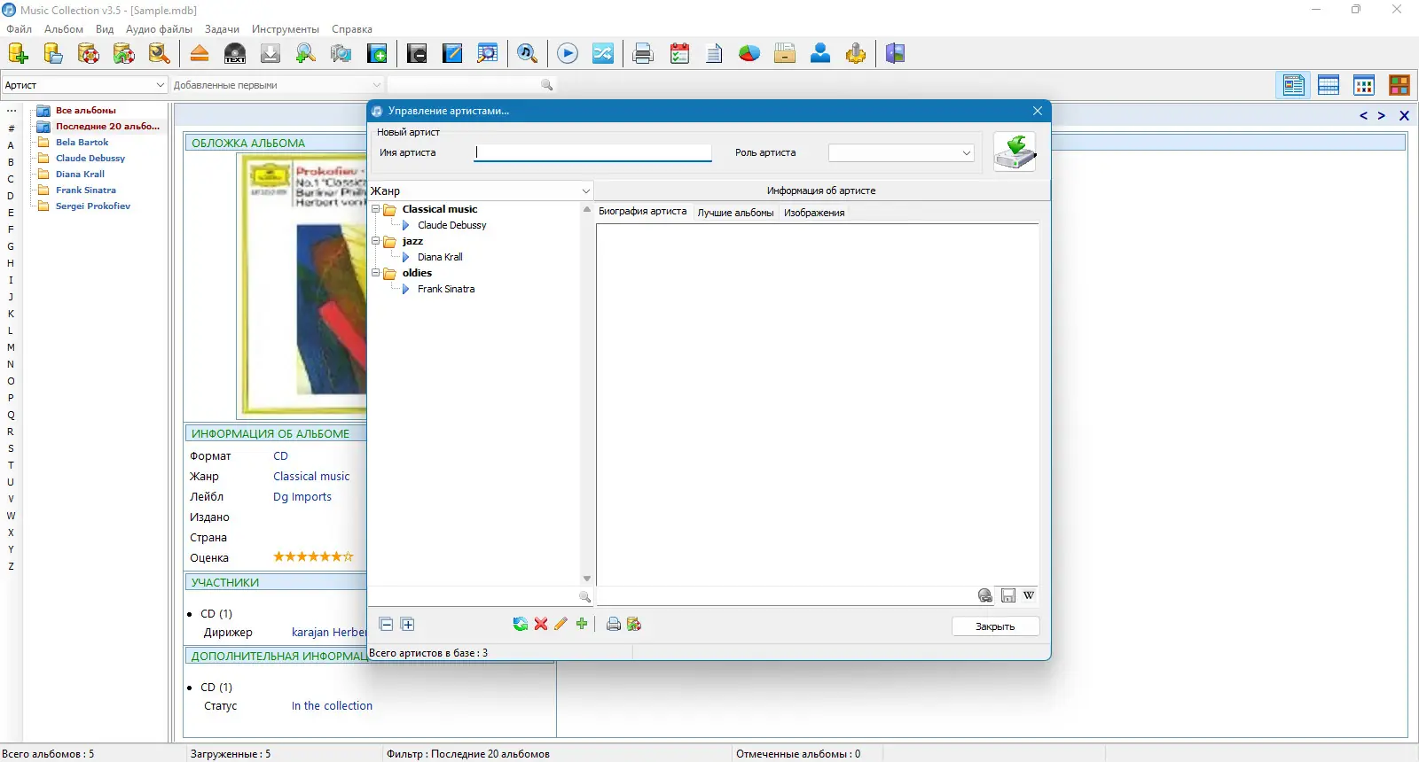 Программа Music Collection разработана для тех, кто ценит порядок в цифровой музыке. Она поддерживает работу с различными форматами аудиофайлов, включая mp3, wav, flac, ogg и другие, обеспечивая полное распознавание данных с локальных дисков и внешних носителей. Каждый альбом можно дополнить обложкой, списком треков, текстами песен и справочной информацией об исполнителе. Данные сохраняются в базе Microsoft Access, что гарантирует надёжность хранения и возможность работы с несколькими коллекциями одновременно.