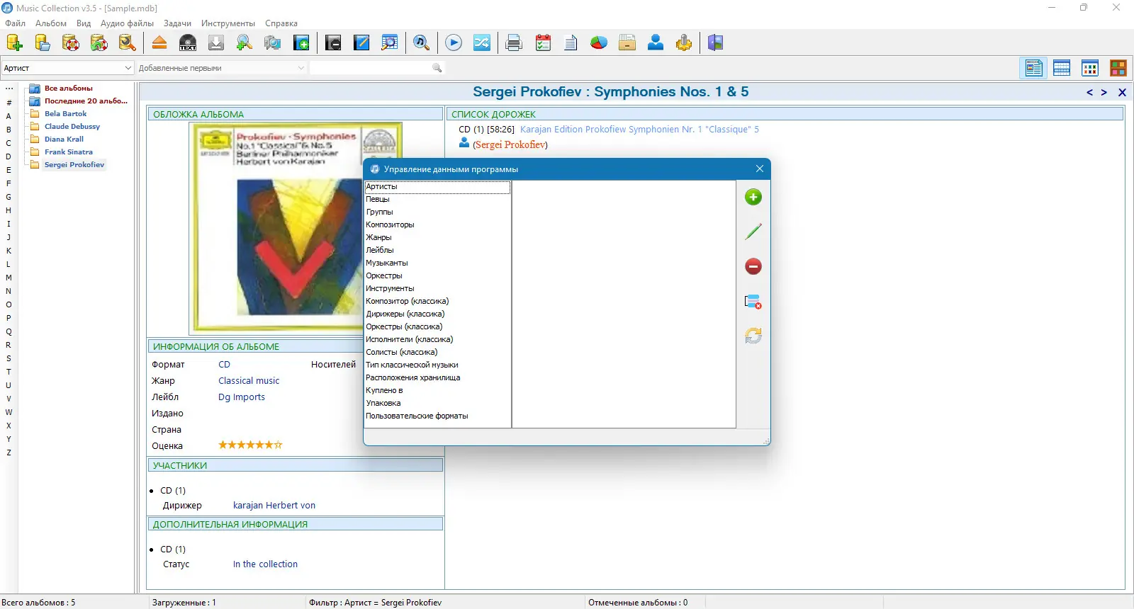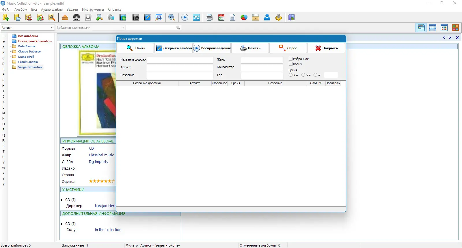 Music Collection — это удобное приложение для систематизации музыкальной библиотеки на компьютере. Программа позволяет создавать детализированные записи о композициях, альбомах и исполнителях, автоматически извлекая информацию из интернета. С её помощью можно эффективно управлять коллекцией, используя фильтры, поиск и визуальные настройки.