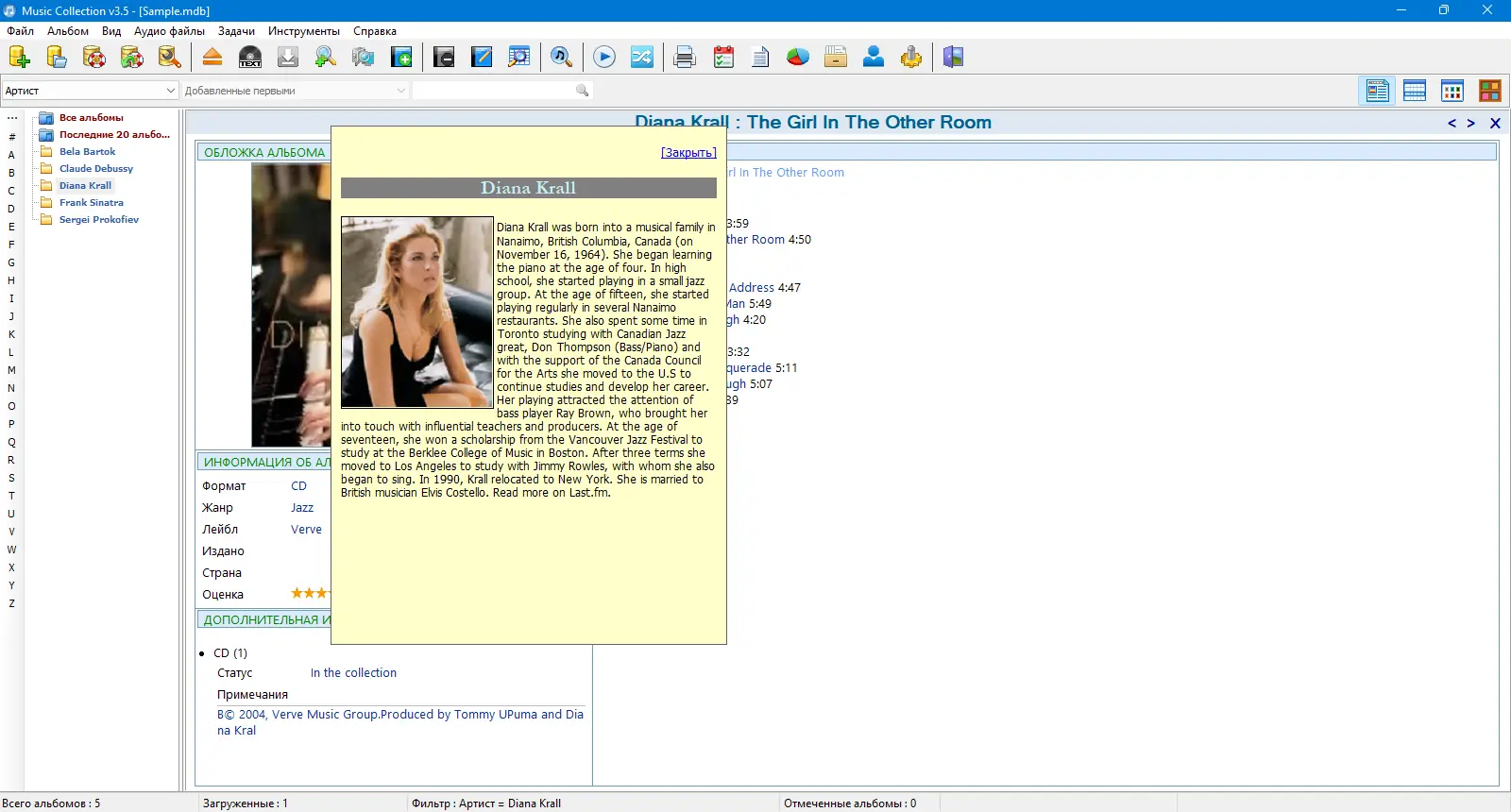 Music Collection — это специализированное программное обеспечение, предназначенное для создания и управления персональной музыкальной коллекцией. Приложение поддерживает распознавание всех распространённых форматов аудиофайлов, включая mp3, wav, flac, ogg и другие, а также автоматически извлекает данные с компакт-дисков. Информация о треках может быть внесена вручную или загружена из онлайн-источников, что обеспечивает точность и экономит время пользователя. Программа создаёт базу данных в формате Microsoft Access, что гарантирует надёжное хранение и лёгкий доступ к информации.