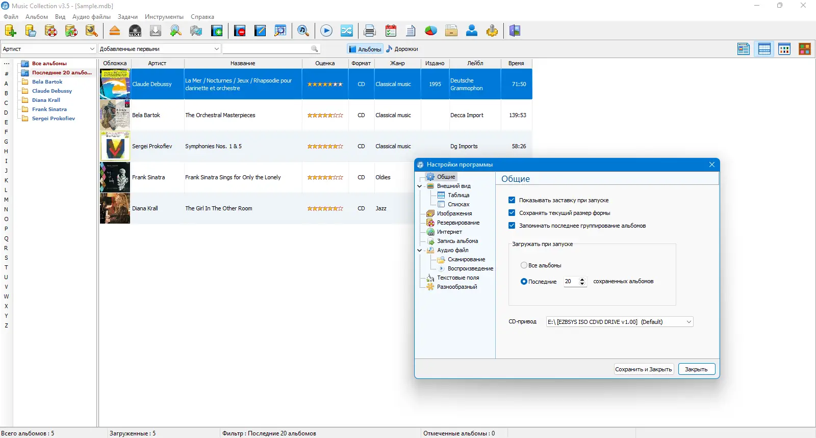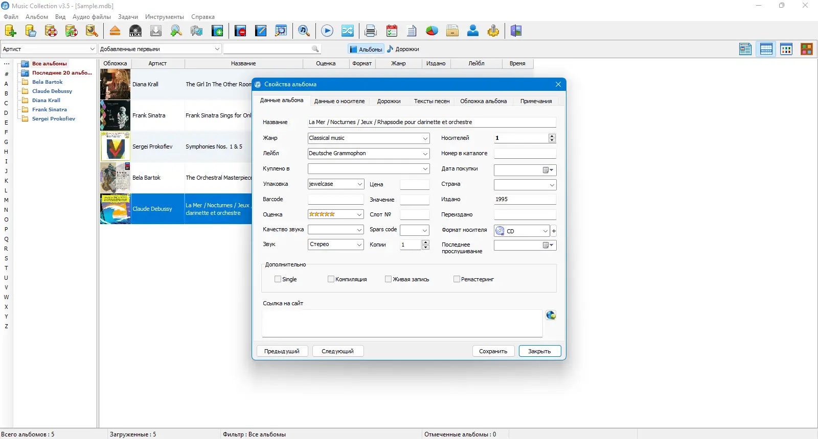 Music Collection — удобное приложение для систематизации музыкальной библиотеки на компьютере, позволяющее управлять коллекцией, редактировать метаданные и автоматически получать информацию из интернета, включая обложки альбомов и тексты песен.