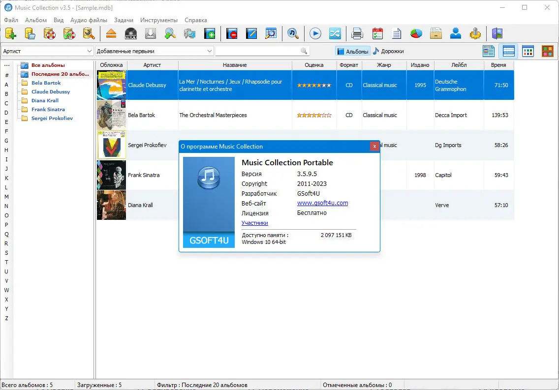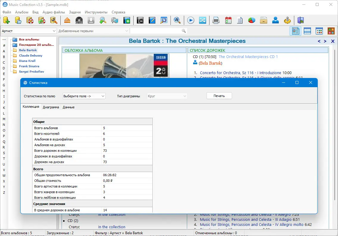 Music Collection — удобное приложение для систематизации и управления музыкальной библиотекой на персональном компьютере. Программа позволяет собирать, редактировать и просматривать информацию о треках, альбомах и исполнителях, автоматически подгружая данные из интернета. С её помощью можно быстро находить нужные композиции, настраивать отображение и даже экспортировать сведения в HTML.