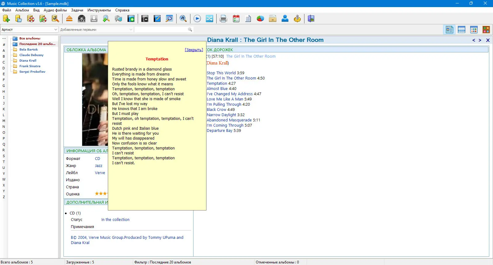 Music Collection — это удобное приложение для систематизации и прослушивания музыкальной библиотеки на компьютере. Программа позволяет создавать структурированные коллекции, редактировать метаданные, искать треки по различным критериям и автоматически получать информацию из интернета. С её помощью можно превратить хаотичный набор аудиофайлов в упорядоченную медиатеку с обложками, текстами песен и детальной информацией об альбомах.