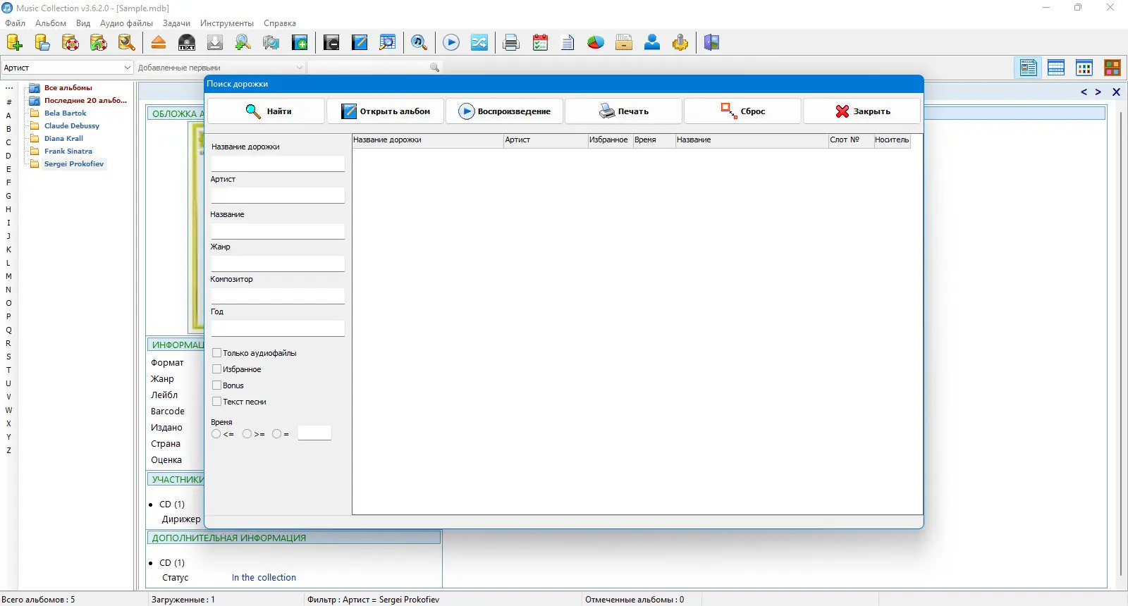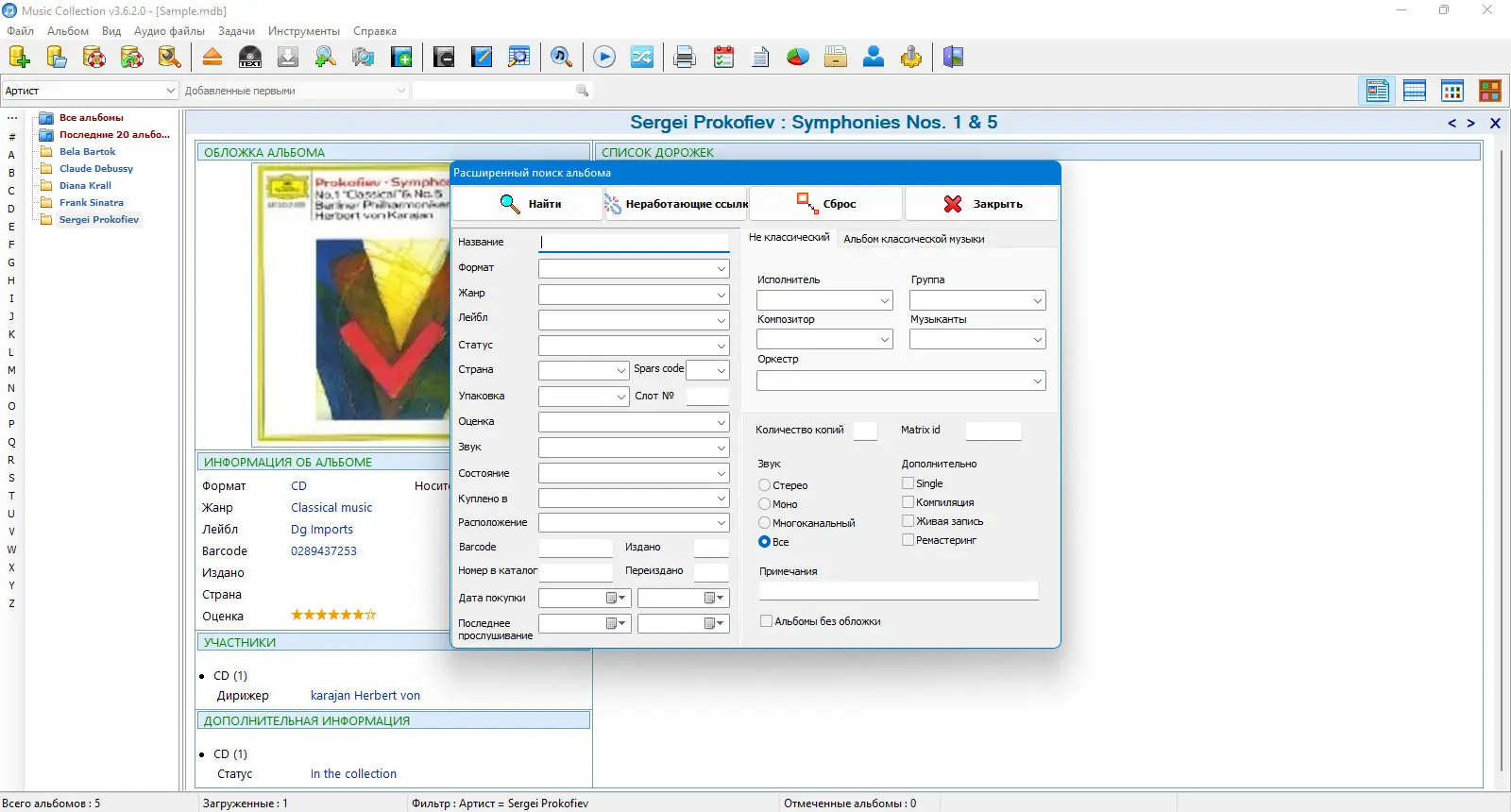 Для начала работы необходимо добавить папки с аудиофайлами в программу, после чего она автоматически начнёт сканирование и распознавание. При наличии подключения к интернету Music Collection загружает недостающие данные, включая названия треков, года выпуска и обложки альбомов. Пользователь может вручную корректировать любые поля, добавлять переводы текстов или комментарии. Поиск осуществляется через расширенный фильтр, где можно комбинировать критерии, например, выбрать все альбомы в формате cd, относящиеся к жанру deep house, с сортировкой по исполнителю и году. В версии 3.6.2.0 появилась возможность находить битые ссылки в альбомах и создавать внешние плейлисты, что упрощает доступ к трекам из других приложений.