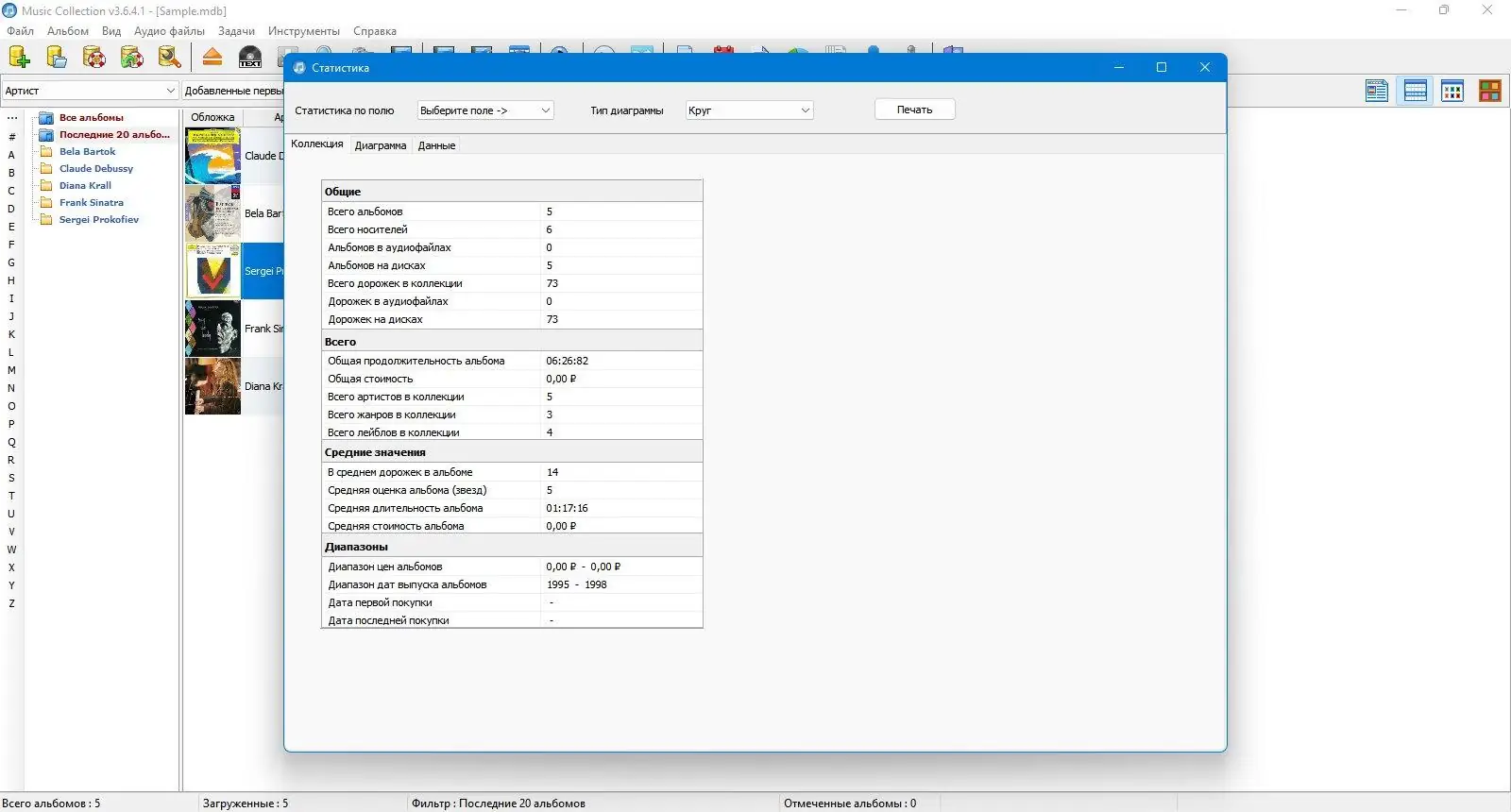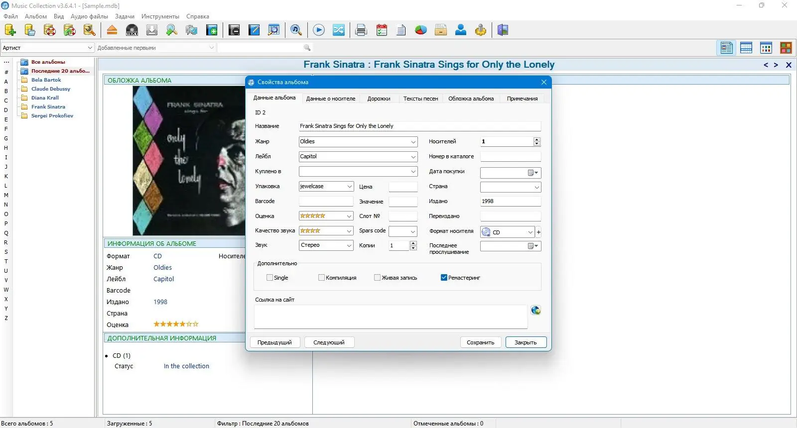 Music Collection разработана для тех, кто стремится привести свою музыкальную коллекцию в порядок и получить быстрый доступ к нужным композициям. Программа работает с базой данных в формате Microsoft Access, что обеспечивает стабильность и надёжность хранения информации. Пользователь может создавать неограниченное количество отдельных коллекций, разделяя, например, музыку по жанрам, годам или форматам носителей.