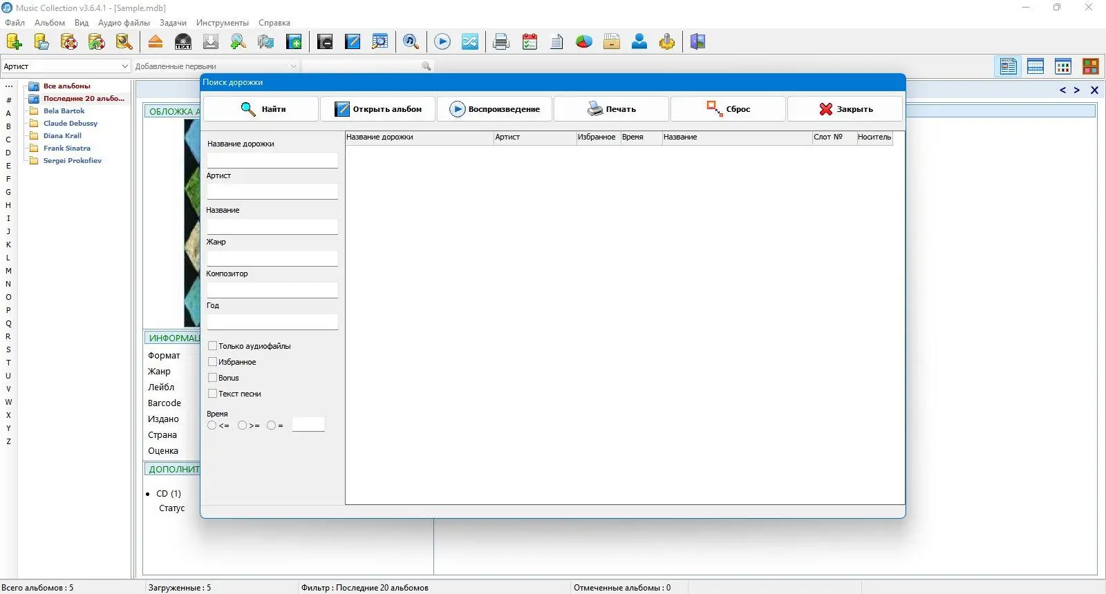 Программа предлагает гибкие инструменты поиска и фильтрации, позволяя находить нужные композиции по исполнителю, названию, году выпуска, жанру и другим параметрам.
