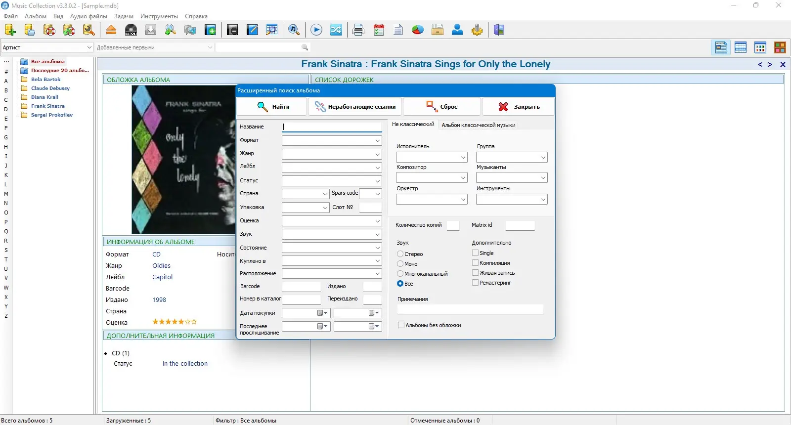 Music Collection разработана для тех, кто ценит порядок в цифровой музыке. Программа работает с базой данных в формате Microsoft Access, что обеспечивает надежное хранение информации и возможность быстрого доступа к записям. Пользователь может создавать неограниченное количество отдельных коллекций, каждую из которых можно посвятить определённому жанру, исполнителю или настроению. Поддерживаются все распространённые аудиоформаты, включая mp3, flac, wav, ogg и другие, а также данные с физических дисков.