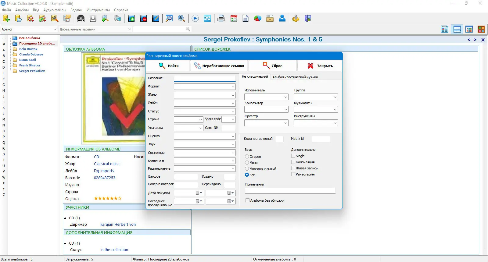 Music Collection — программа для систематизации и управления музыкальной библиотекой на компьютере. Она позволяет создавать детализированные описания альбомов, редактировать метаданные треков, искать композиции по множеству параметров и экспортировать данные. Приложение поддерживает автоматическое распознавание файлов, загрузку информации из интернета и настройку внешнего вида.