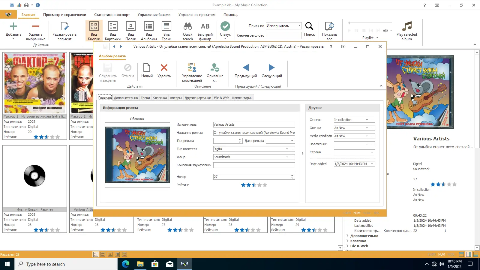 Использование приложения начинается с добавления первого альбома в базу. Для CD достаточно вставить диск в привод — система автоматически определит штрих-код и загрузит данные из интернета. Для винила или кассет предусмотрен ручной ввод: можно указать исполнителя, название, год, жанр и прикрепить изображение обложки. Поддержка импорта из Discogs позволяет мгновенно перенести уже существующую онлайн-коллекцию. Встроенный плеер даёт возможность прослушивать MP3 и другие цифровые файлы прямо в программе, не открывая сторонние приложения. Поиск по ключевым словам, фильтрация по жанру или году выпуска, а также возможность сортировки по любому полю делают навигацию интуитивной и быстрой.