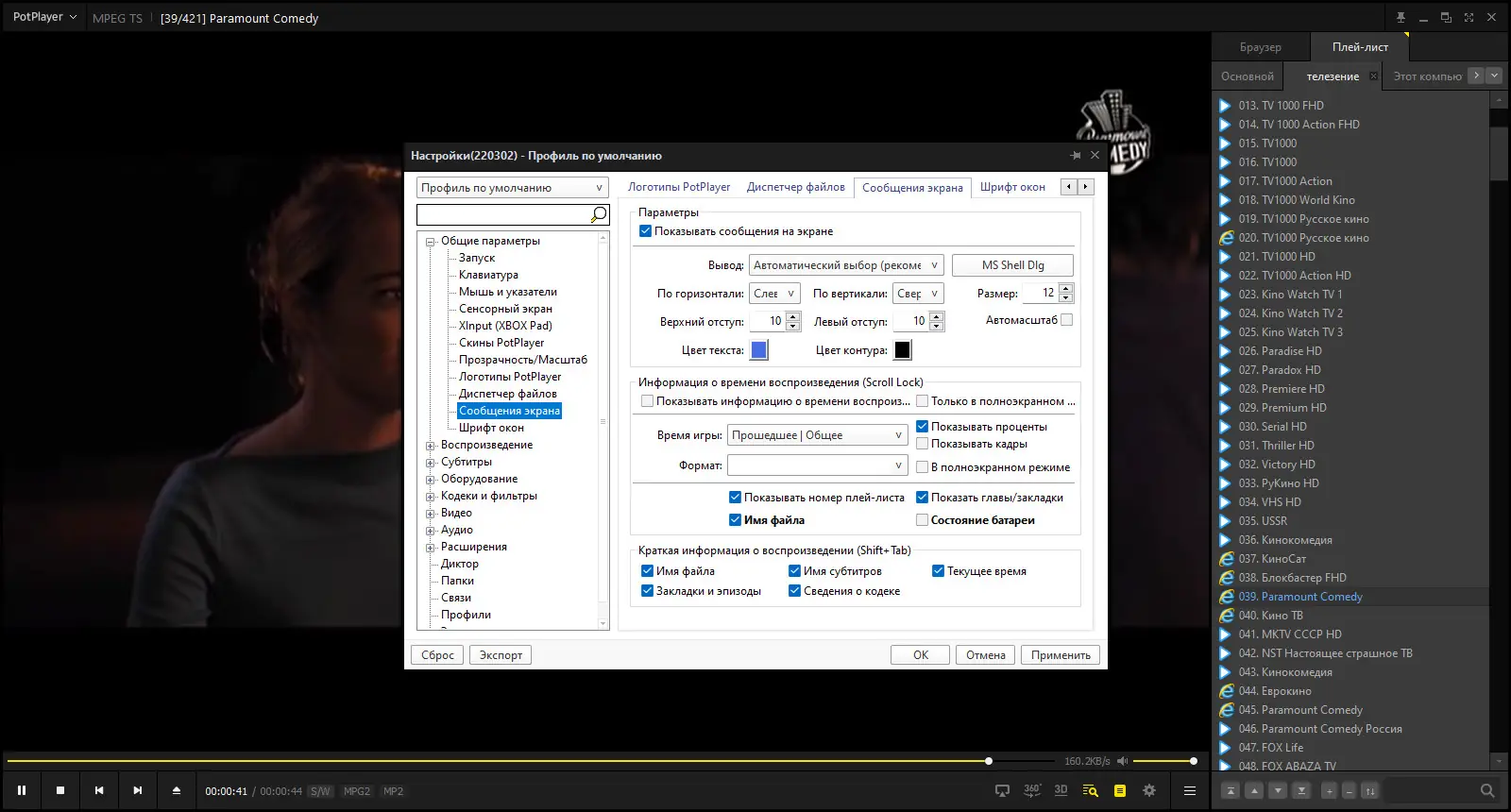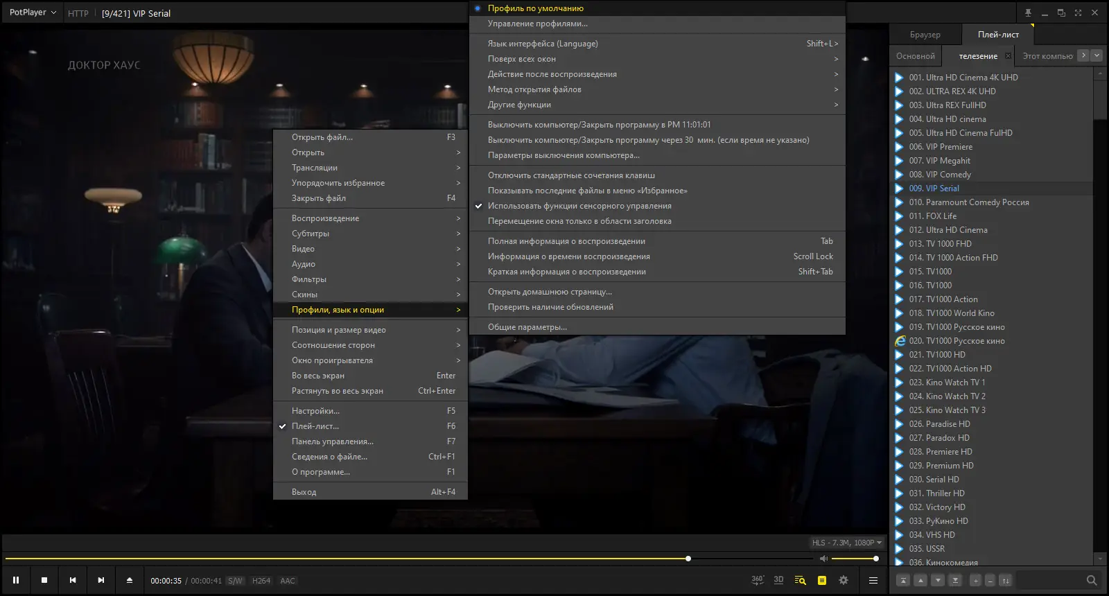 После установки PotPlayer автоматически ассоциируется с основными медиаформатами, и любое видео или аудио начинает воспроизводиться в нём по умолчанию. Управление осуществляется как через интерфейс, так и с помощью горячих клавиш, которые можно настраивать под себя. Например, с помощью клавиш Num1,2,4 и других можно изменять масштаб изображения, а комбинации с Ctrl позволяют смещать видео в пределах окна. Для настройки качества изображения доступны встроенные фильтры, коррекция цвета, шарпинг и шумоподавление. Также можно подключать сторонние DSP-плагины для улучшения звучания и добавления визуализации при воспроизведении музыки.