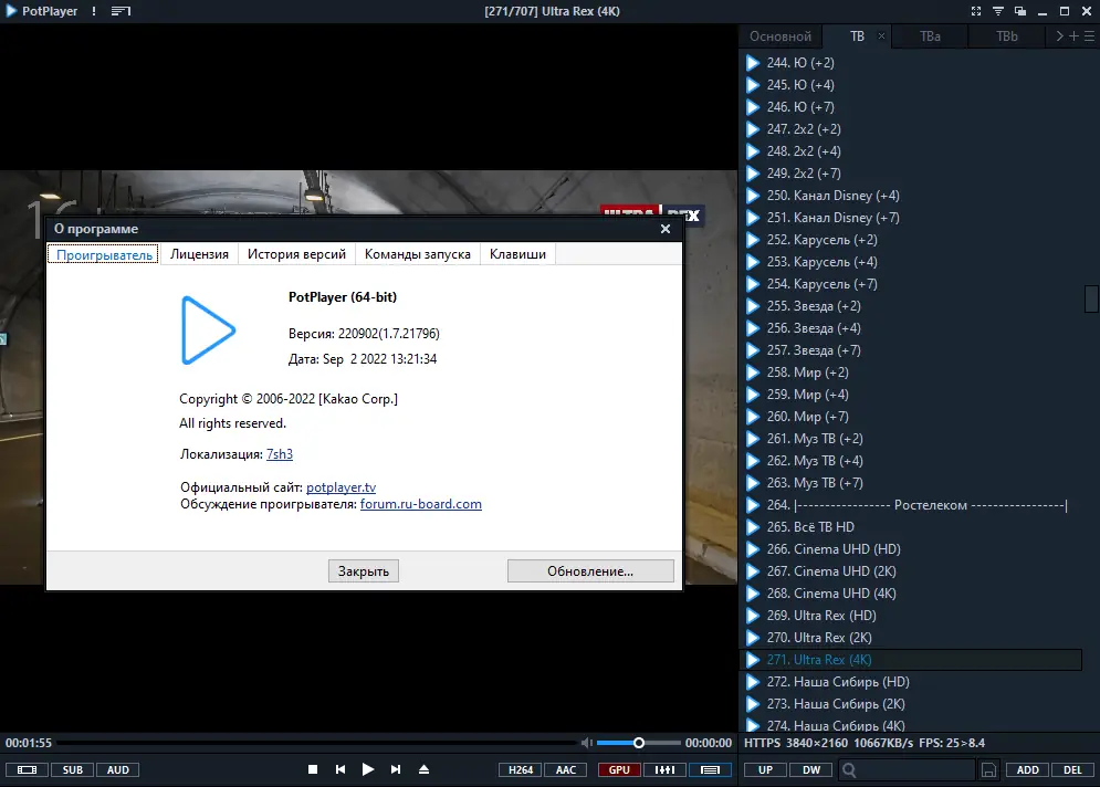 Daum PotPlayer — это современный медиаплеер, разработанный южнокорейской компанией Daum, известной по созданию KMPlayer. Программа отличается высокой производительностью, минимальным потреблением системных ресурсов и поддержкой практически всех известных форматов без необходимости установки дополнительных кодеков. В основе работы лежит использование встроенных DXVA-декодеров, что обеспечивает плавное воспроизведение даже в высоком разрешении, включая 4K и HDR. Пользователи отмечают чёткую картинку, насыщенный звук и стабильность при длительном использовании.