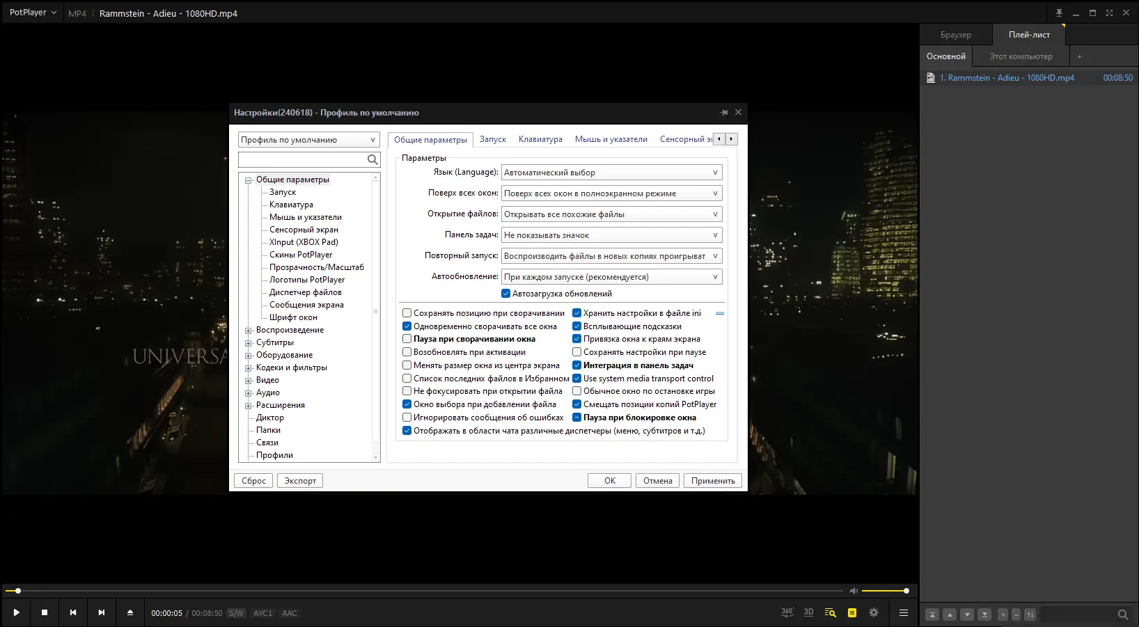 Использование PotPlayer не вызывает сложностей даже у новичков, несмотря на обилие функций. Достаточно запустить файл, и плеер автоматически определит нужный кодек и начнёт воспроизведение. Через контекстное меню можно быстро получить доступ к настройкам аудио, видео, субтитров и эквалайзеру. Для тонкой настройки доступен расширенный режим параметров, где можно регулировать баланс цветов, задавать правила автоматического выбора дорожек и настраивать поведение при запуске.