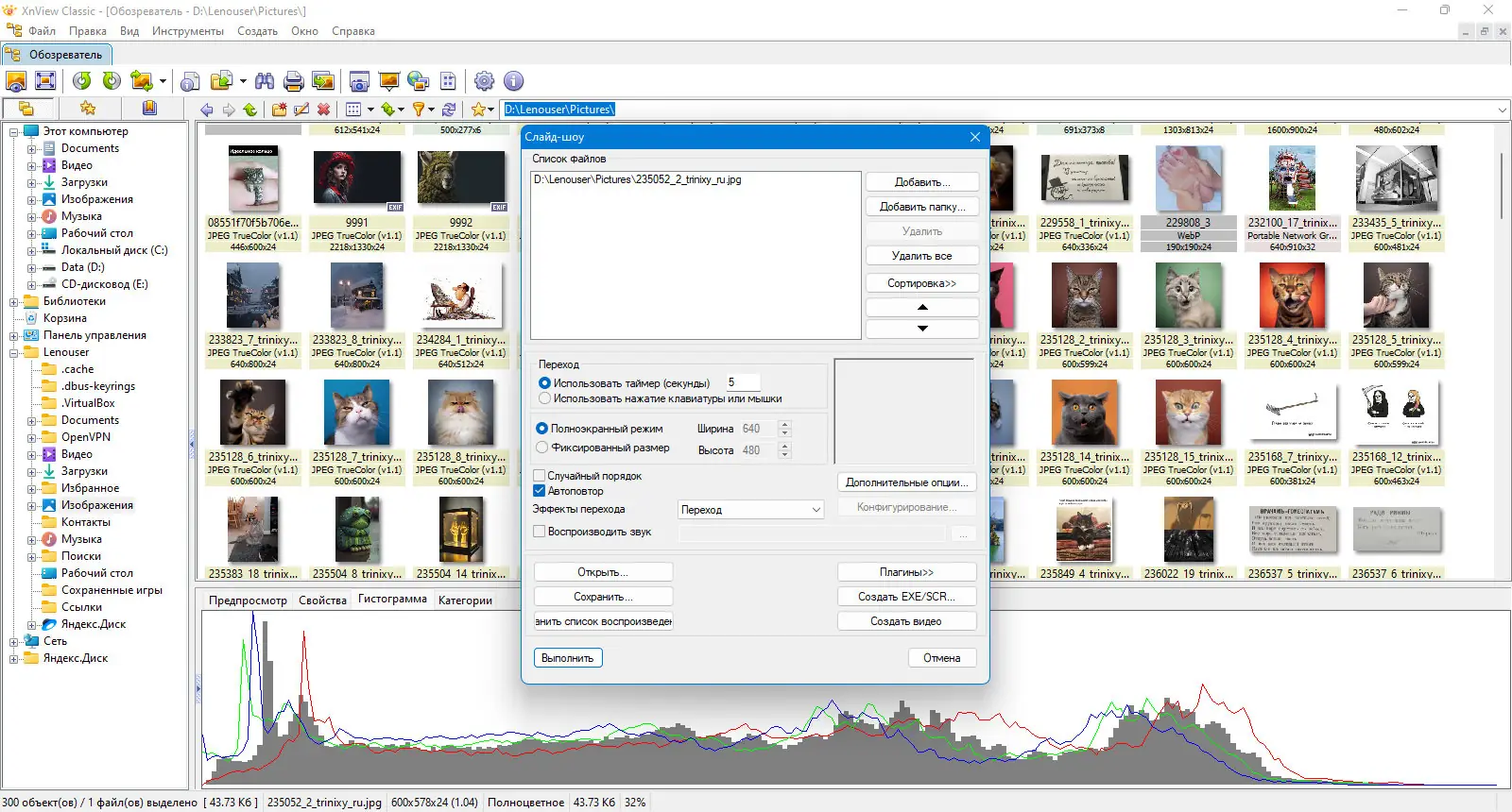 Интерфейс XnView Classic интуитивно понятен и организован в виде двухпанельного проводника, где в левой части отображается структура папок, а в правой — содержимое выбранной директории. Просмотр изображений осуществляется в режиме реального времени, с возможностью масштабирования, поворота и применения фильтров. Для пакетной обработки используется встроенный конвертер, где можно задать формат, размер, качество и правила переименования файлов. Режим слайд-шоу поддерживает настройку задержки, переходов и фоновой музыки, а создание веб-страниц позволяет быстро сформировать галерею на основе выбранных изображений. Программа также включает инструменты для печати, редактирования XMP-тегов и создания многостраничных документов.