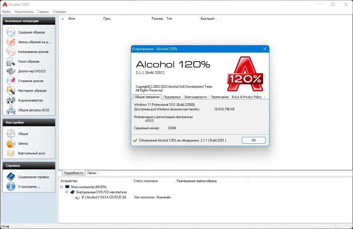 Alcohol 120% доступен для установки на компьютеры под управлением Windows. Программа поддерживает операционные системы от Windows 7 до Windows 11, включая 32- и 64-битные версии. Русский язык интерфейса обеспечивает комфортное использование без необходимости дополнительных настроек. Скачать Alcohol 120% можно с официальных источников, где также представлены актуальные обновления и патчи для стабильной работы.