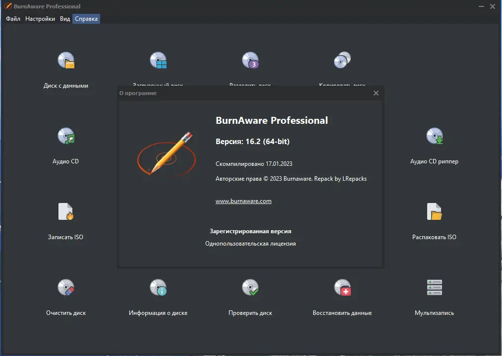 BurnAware — это универсальное приложение для записи, копирования и управления оптическими дисками и образами. Программа поддерживает CD, DVD, Blu-Ray и HD-DVD, обеспечивая надёжную запись данных, аудио и видео, а также создание и монтаж образов. Интерфейс интуитивно понятен, а функционал охватывает все ключевые задачи, связанные с работой с носителями.