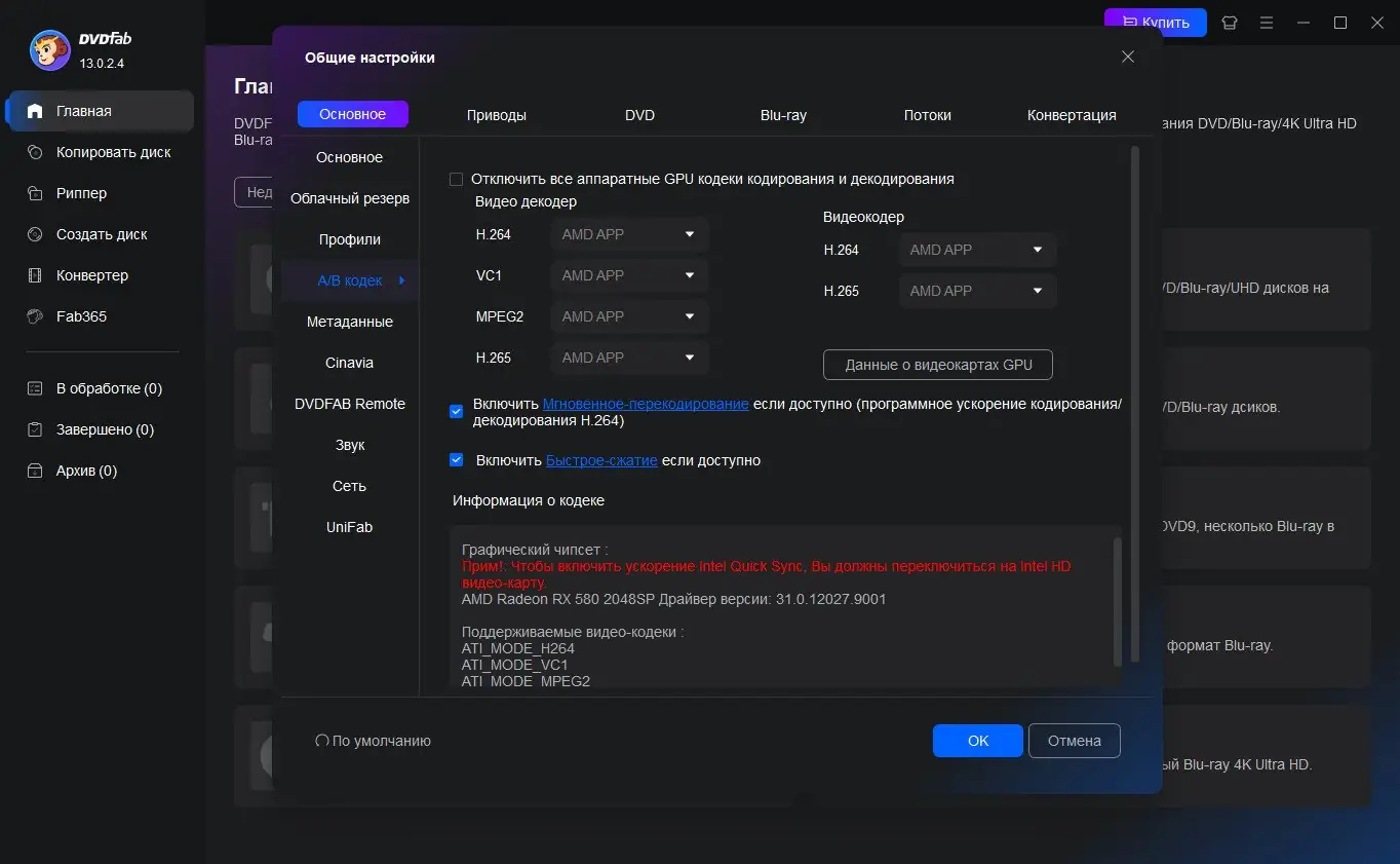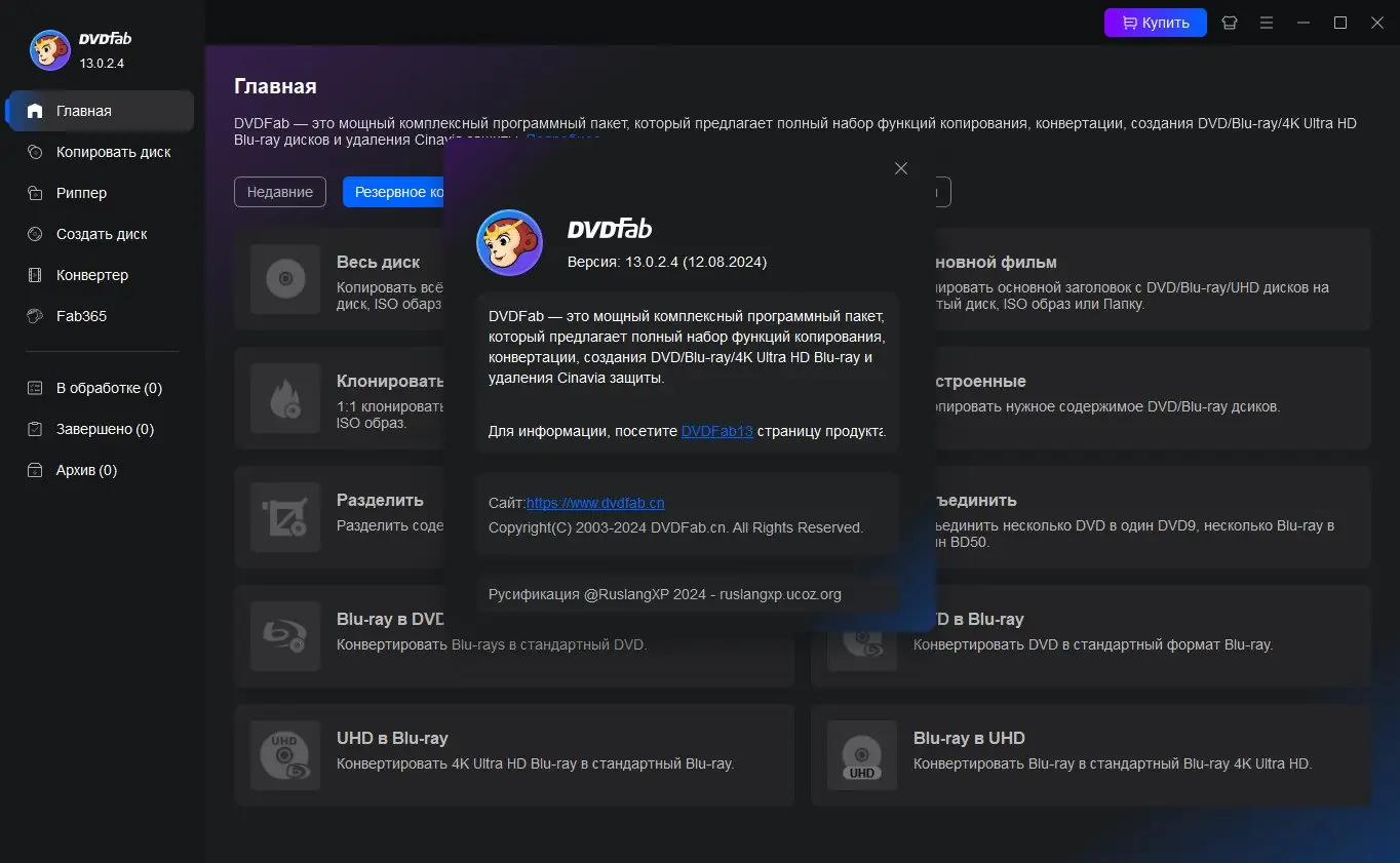 DVDFab — это универсальный инструмент для работы с DVD и Blu-ray дисками, сочетающий функции копирования, конвертации, сжатия и записи. Программа поддерживает снятие различных видов защиты, преобразование контента в форматы для мобильных устройств и работу с образами дисков. Благодаря интуитивному интерфейсу и широкому набору режимов, она подходит как для новичков, так и для опытных пользователей.