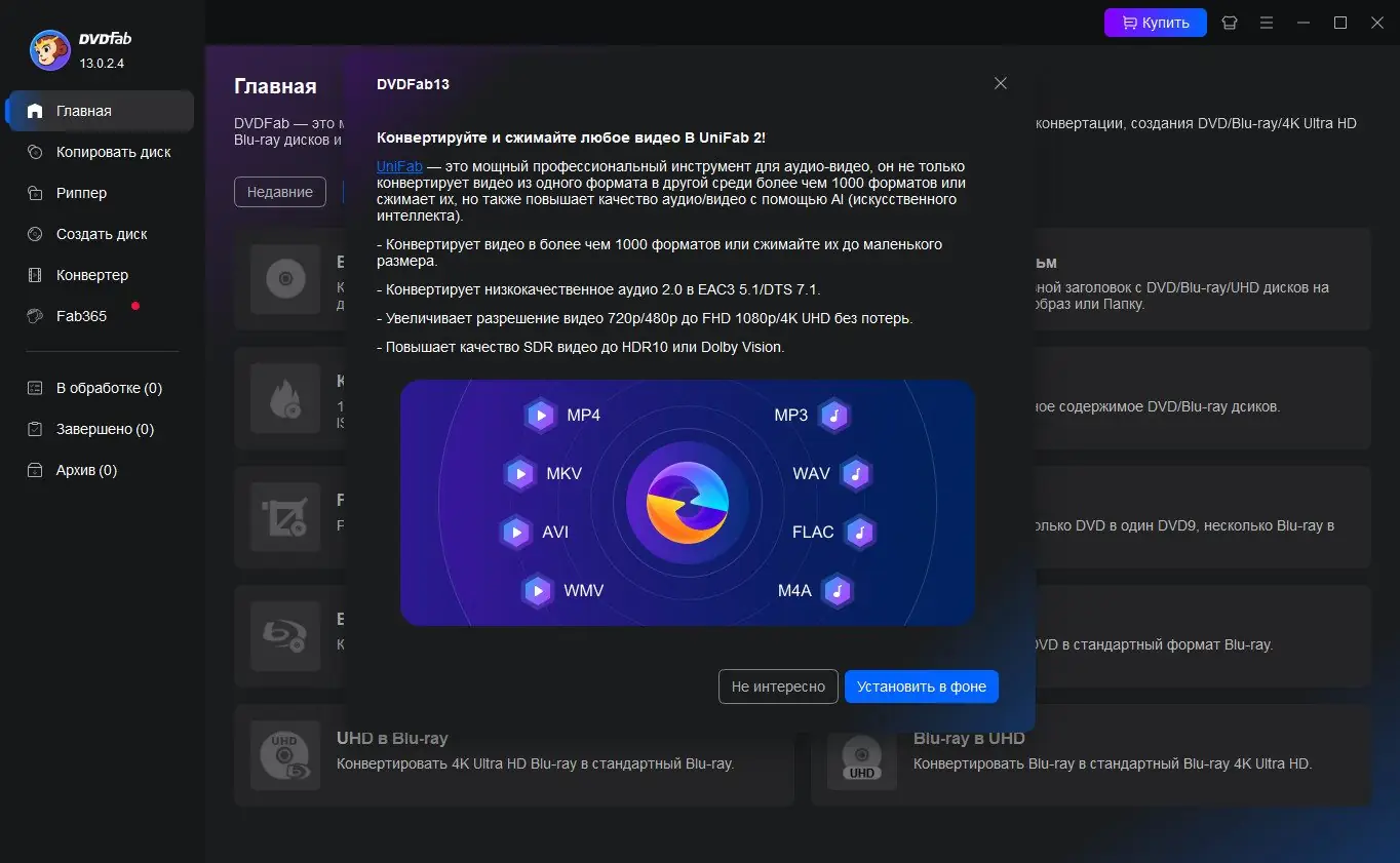 DVDFab представляет собой комплексное решение для обработки оптических носителей, позволяя создавать резервные копии дисков, конвертировать видео и управлять мультимедийным контентом. Программа включает несколько модулей, каждый из которых отвечает за определённую задачу: копирование, риппинг, конвертация и передача файлов. Поддержка современных стандартов и постоянное обновление алгоритмов расшифровки делают её надёжным выбором для работы с защищёнными дисками. Интерфейс переведён на множество языков, включая русский, что упрощает настройку и использование.