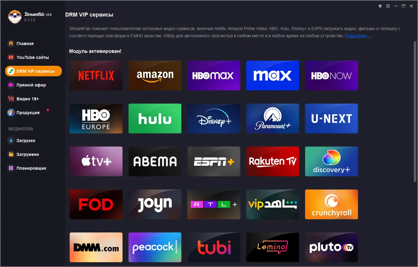 DVDFab StreamFab представляет собой многофункциональный инструмент, предназначенный для сохранения видеоконтента с ведущих онлайн-платформ. С его помощью можно скачивать видео с YouTube, Netflix, Amazon Prime Video, Disney+, Hulu и других сервисов, сохраняя исходное качество. Поддержка форматов включает MP4, MKV, AVI и другие, что обеспечивает совместимость с большинством устройств воспроизведения.