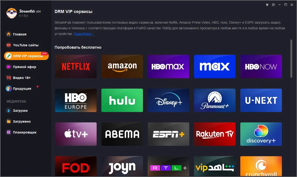 DVDFab StreamFab представляет собой универсальное решение для пользователей, которым необходимо сохранять видео с онлайн-сервисов. Программа поддерживает широкий список платформ, включая YouTube, Netflix, Amazon Prime Video, Hulu и Disney+. Это делает её незаменимым инструментом для тех, кто хочет собирать личную медиатеку без зависимости от интернет-соединения.